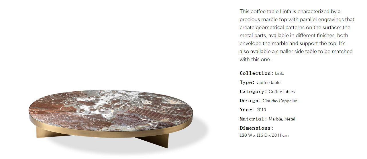 | description | This coffee table Linfa is characterized by a precious marble top with parallel engravings that create geometrical patterns on the surface: the metal parts, available in different finishes, both envelope the marble and support the top. It’s also available a smaller side table to be matched with this one. |