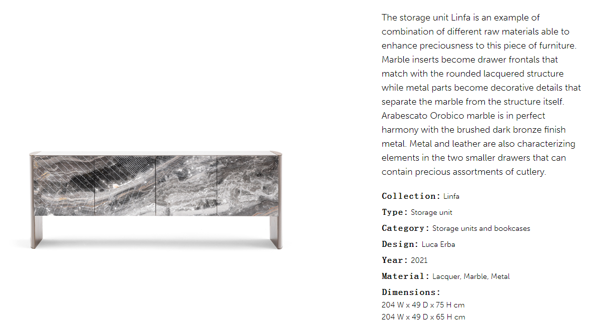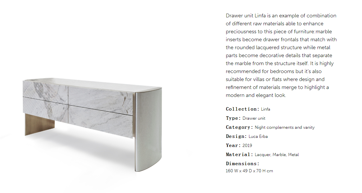 | description | Drawer unit Linfa is an example of combination of different raw materials able to enhance preciousness to this piece of furniture:marble inserts become drawer frontals that match with the rounded lacquered structure while metal parts become decorative details that separate the marble from the structure itself. It is highly recommended for bedrooms but it’s also suitable for villas or flats where design and refinement of materials merge to highlight a modern and elegant look. |