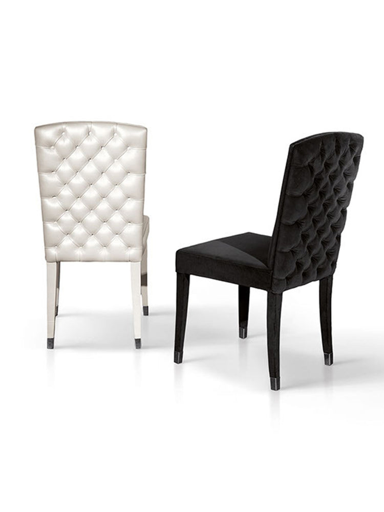 The Alba chair is a perfect combination of forms linked to tradition, but revised in a contemporary key. The height of the backrest with manufacture gives it formal rigor and enveloping proportions. Available with fabric or leather upholstery, the chair offers legs in stained wood or with velvet or leather upholstery |