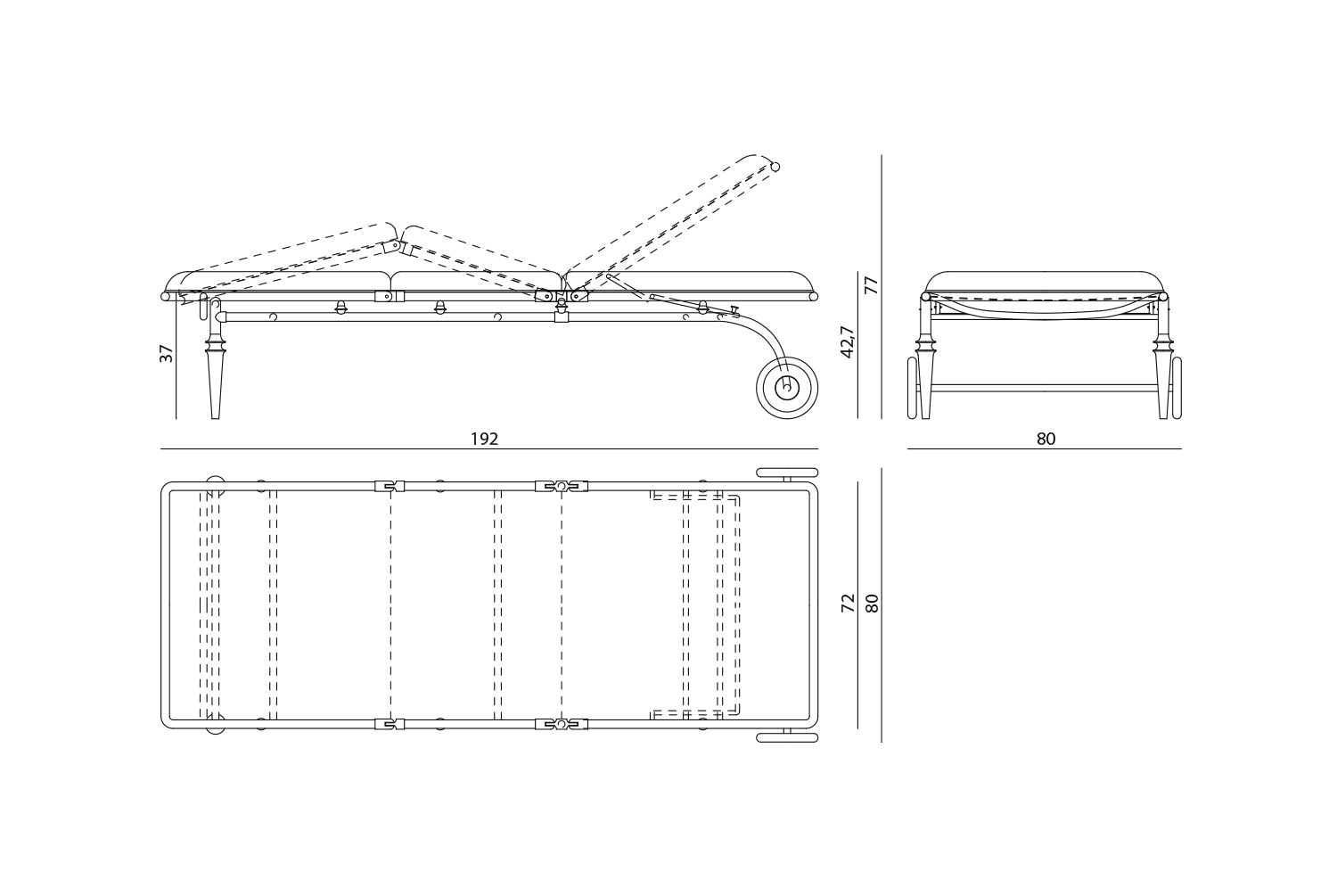 description | Structure in powder painted aluminium. Front legs in polished aluminium with double transparent coating film, optional gold or bronze finishing or powder painted. Cushions in polyurethane foam and acrylic layers. Upholstery in waterproof leather or fabric, embroidered Visionnaire logo. Backrest and footrest adjustable in several positions with supports in brass. Bed provided of wheels in stainless steel with tread in nylon. |