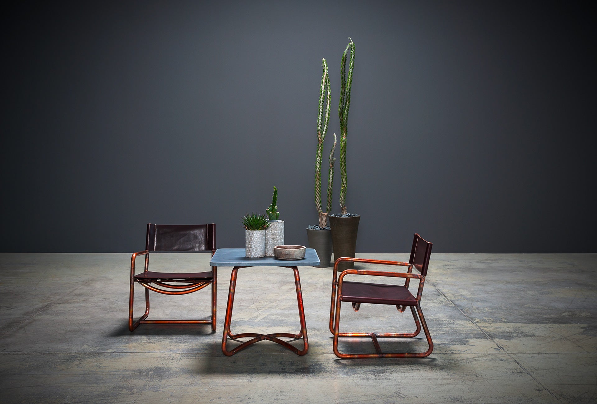description | Rimini is a leather chair designed by Paola Navone. Etched copper tubular frame. Available in Hydro and Pluvia leather only. Protective cover included. |