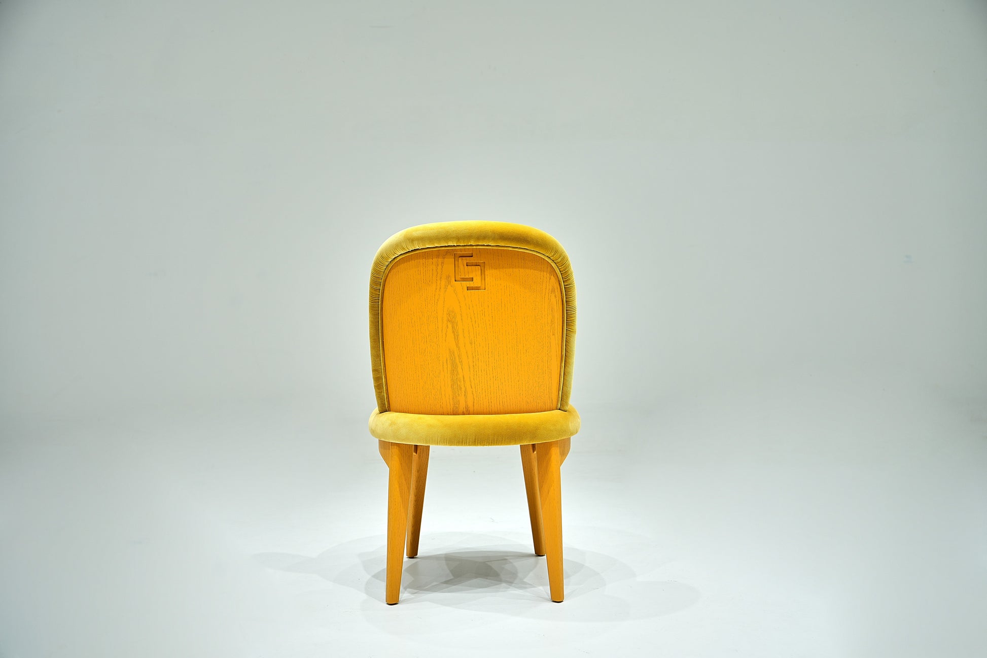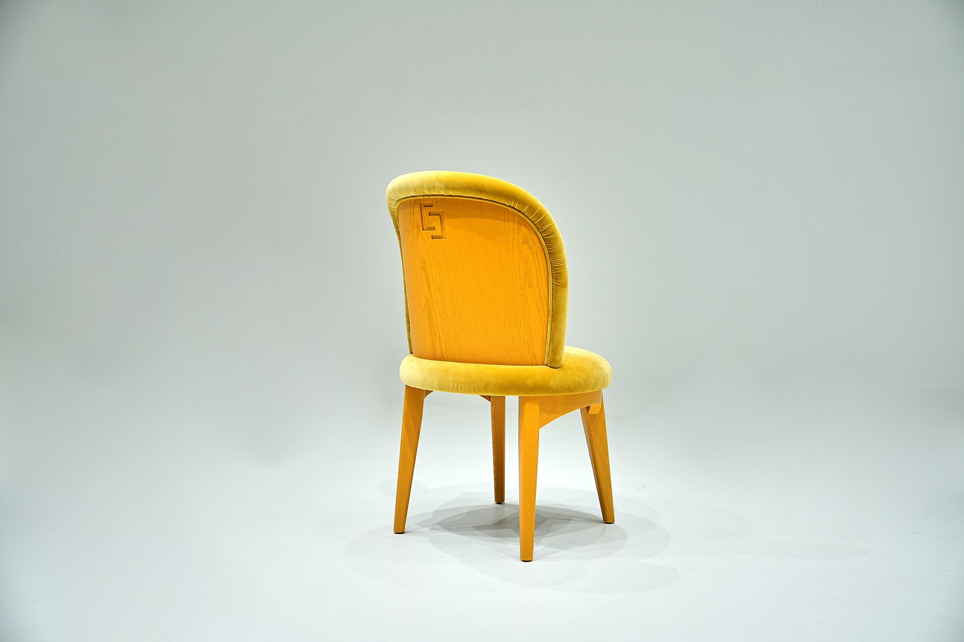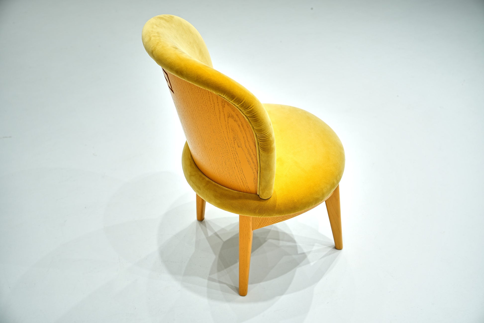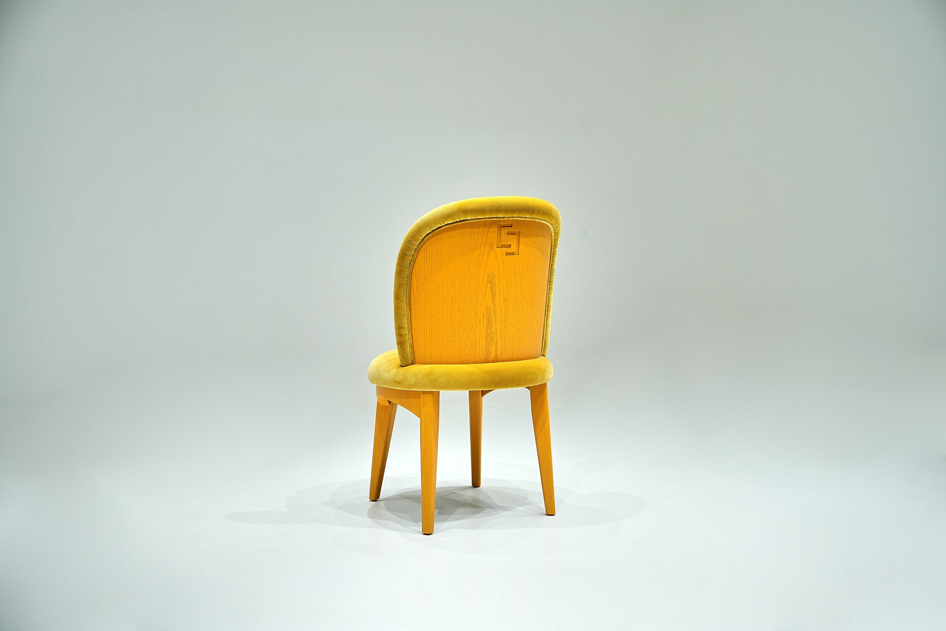Designed by Cristina Celestino Studio, the Ottavia chair echoes Rome's signature architectural elements both in form and function. Showcasing simple geometries and soft lines, the piece is characterised by the arch-shaped legs in lacquered wood, inspired by Palazzo della Civiltà Italiana, and a curved wooden back engraved with the FF logo that seems to naturally unfold around the body. Upholstered for maximum comfort, this sophisticated design is ideal for both living and dining areas.