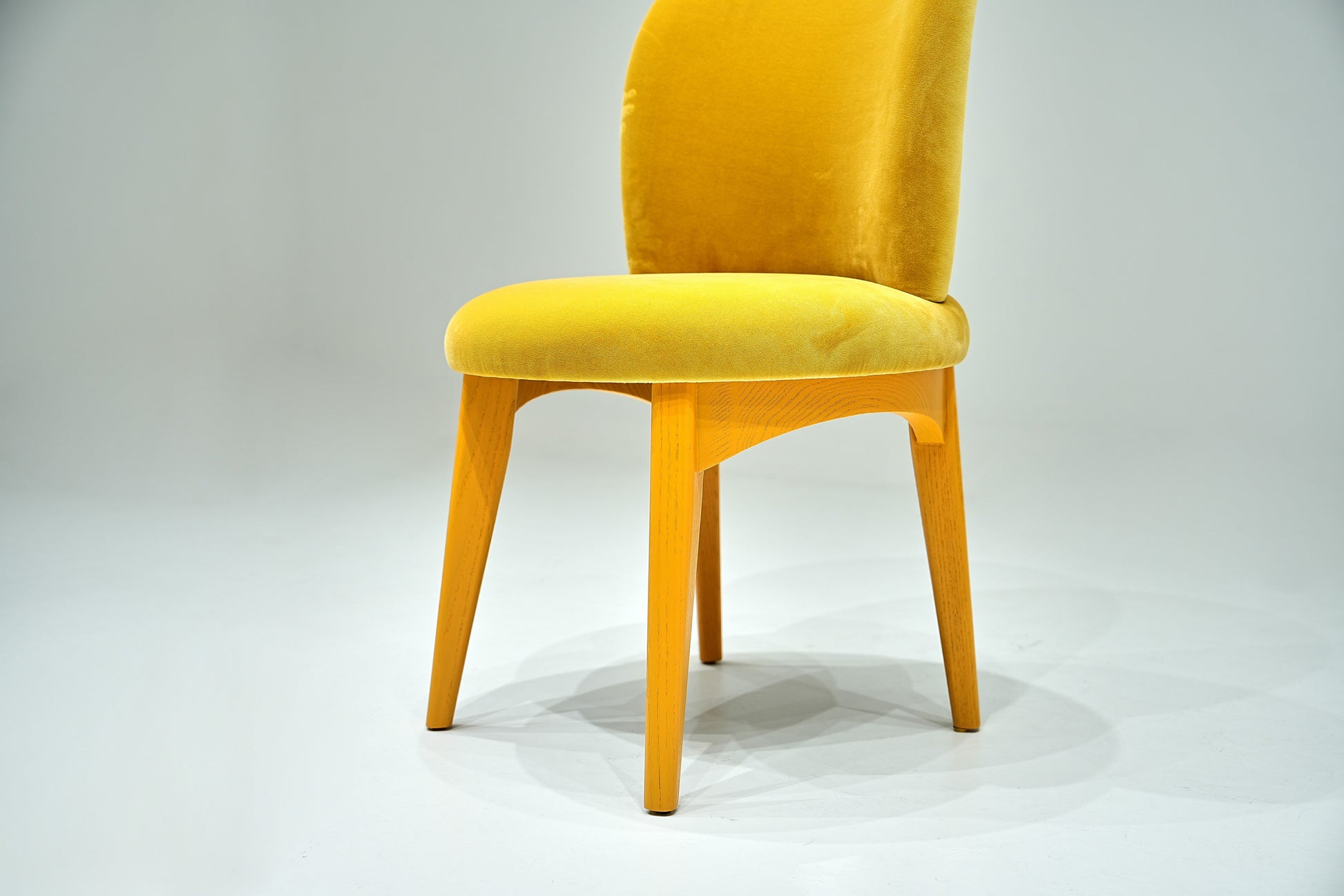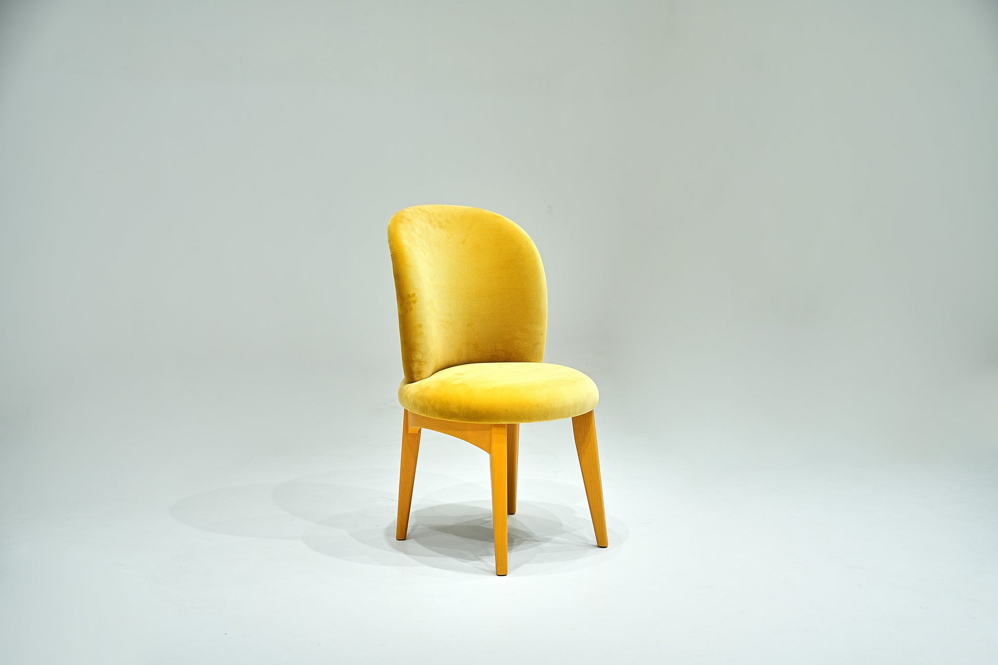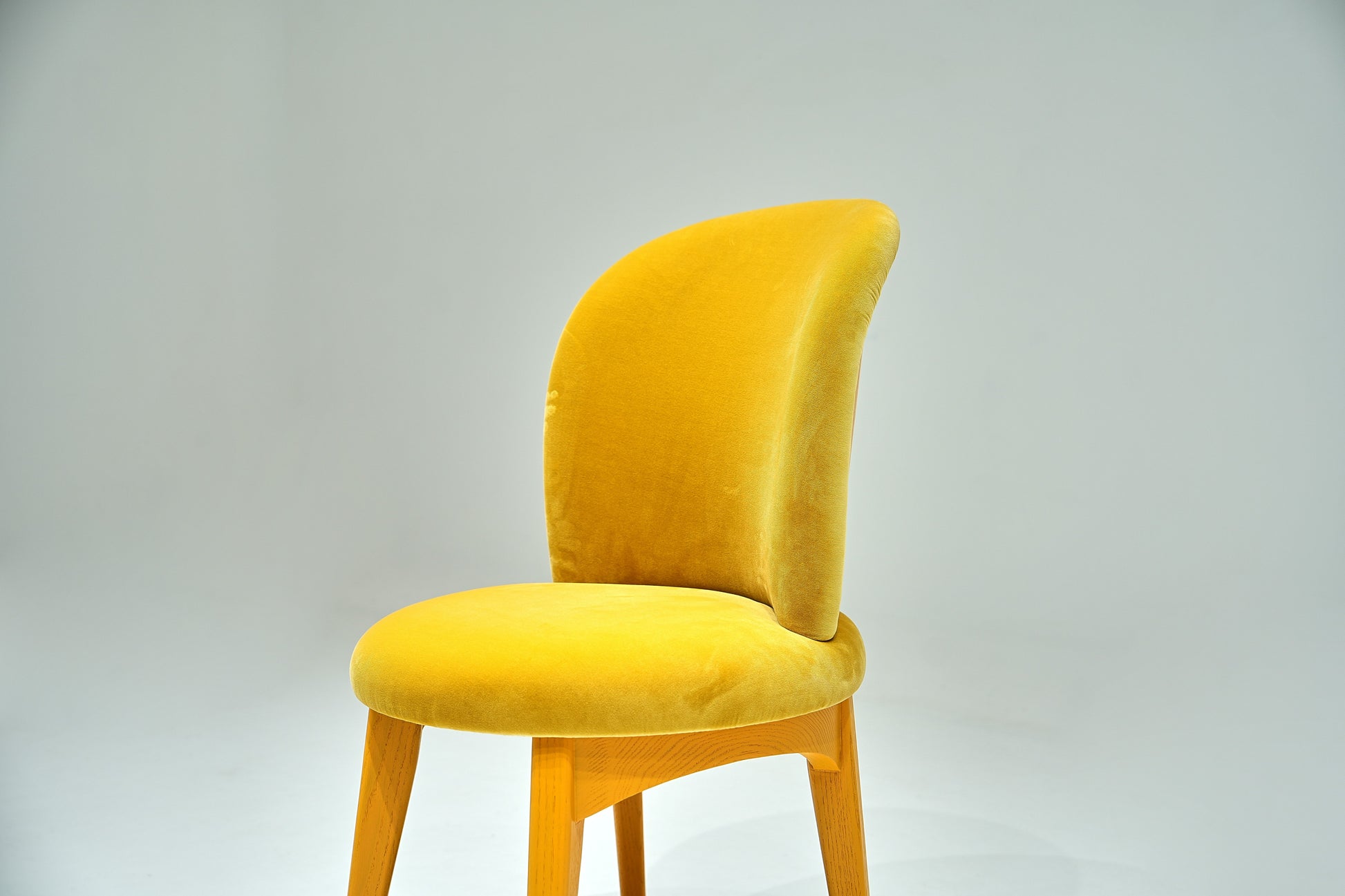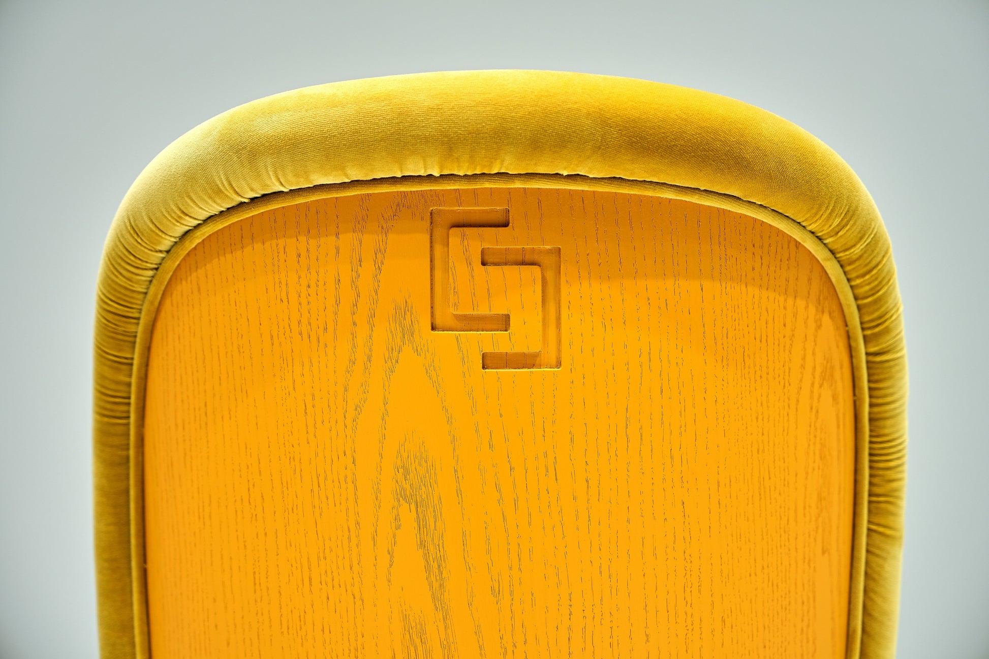Designed by Cristina Celestino Studio, the Ottavia chair echoes Rome's signature architectural elements both in form and function. Showcasing simple geometries and soft lines, the piece is characterised by the arch-shaped legs in lacquered wood, inspired by Palazzo della Civiltà Italiana, and a curved wooden back engraved with the FF logo that seems to naturally unfold around the body. Upholstered for maximum comfort, this sophisticated design is ideal for both living and dining areas.