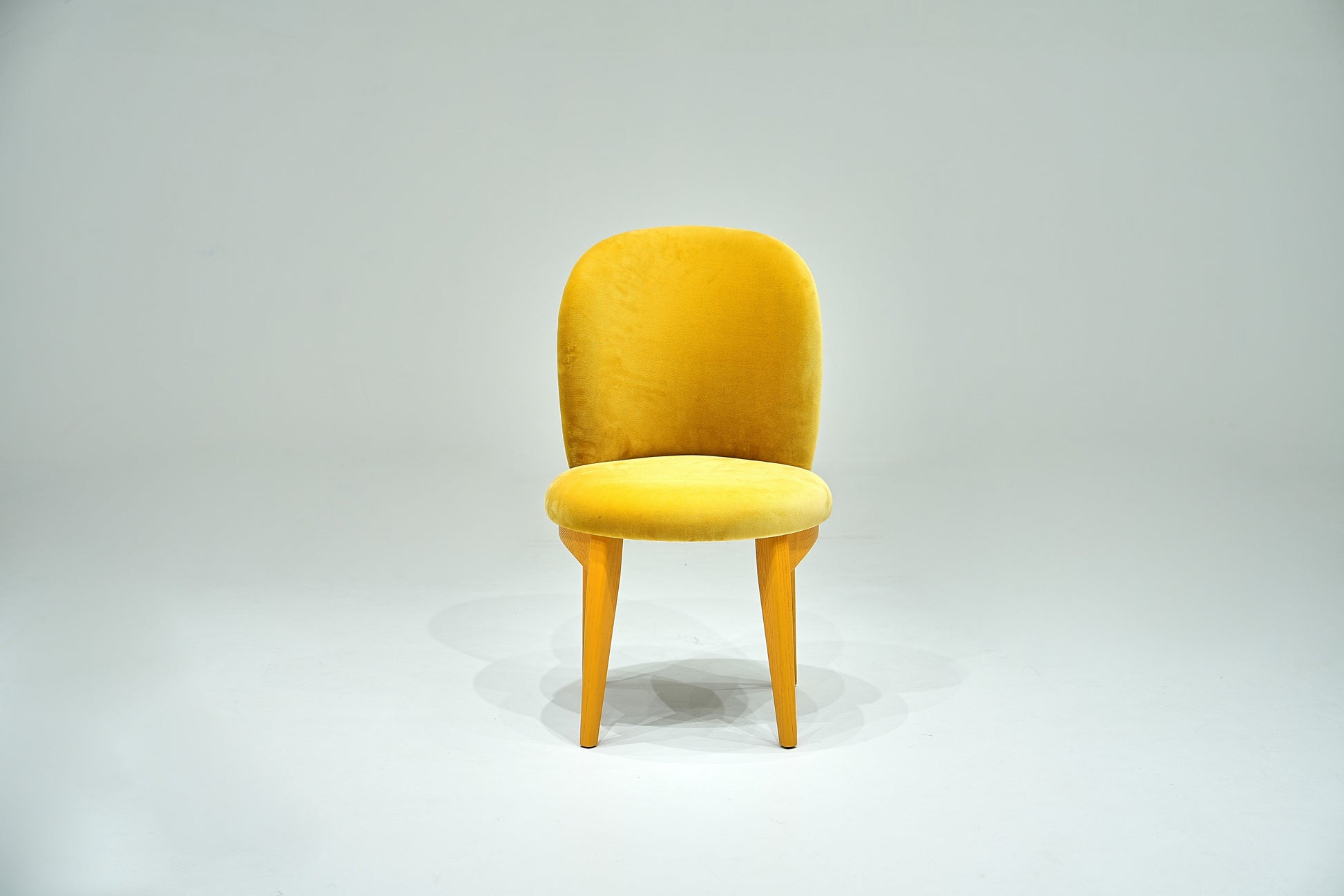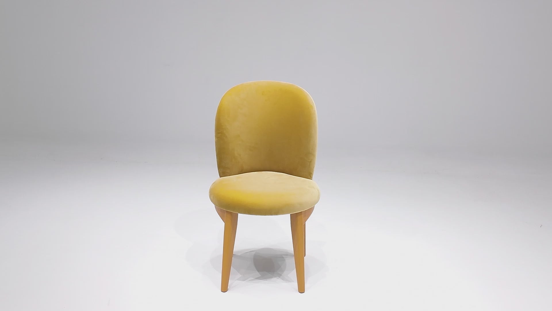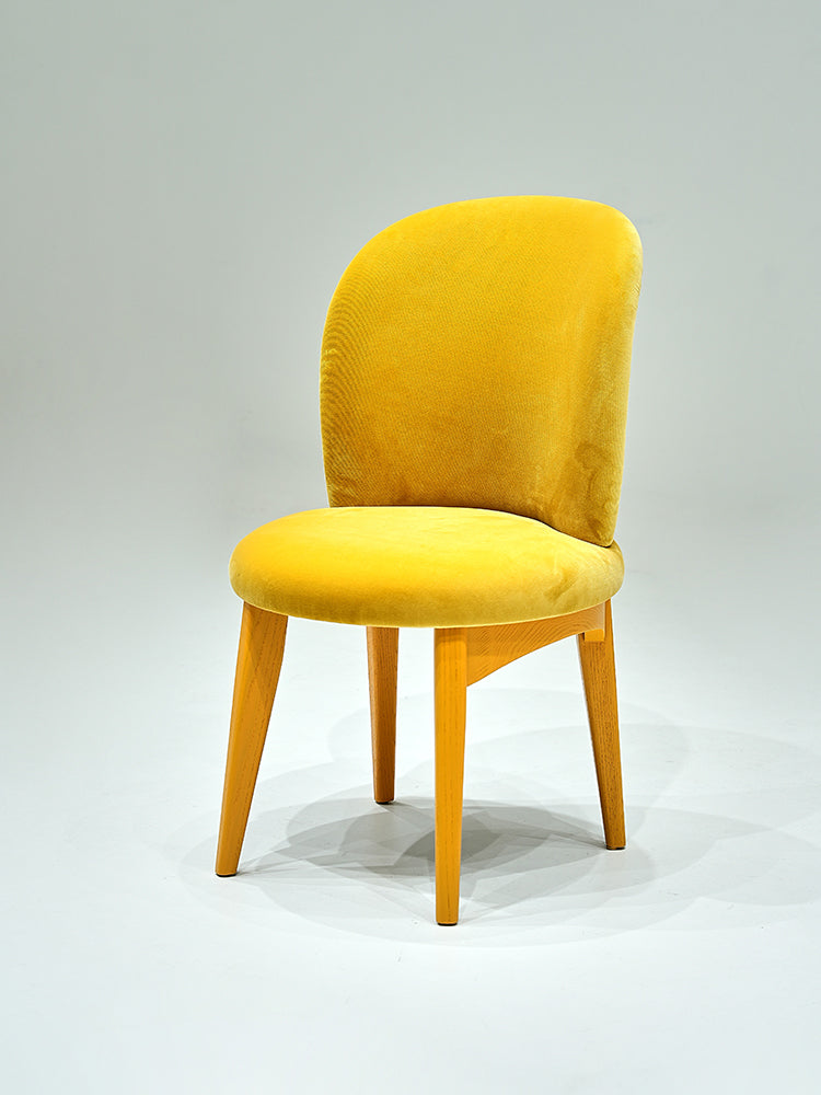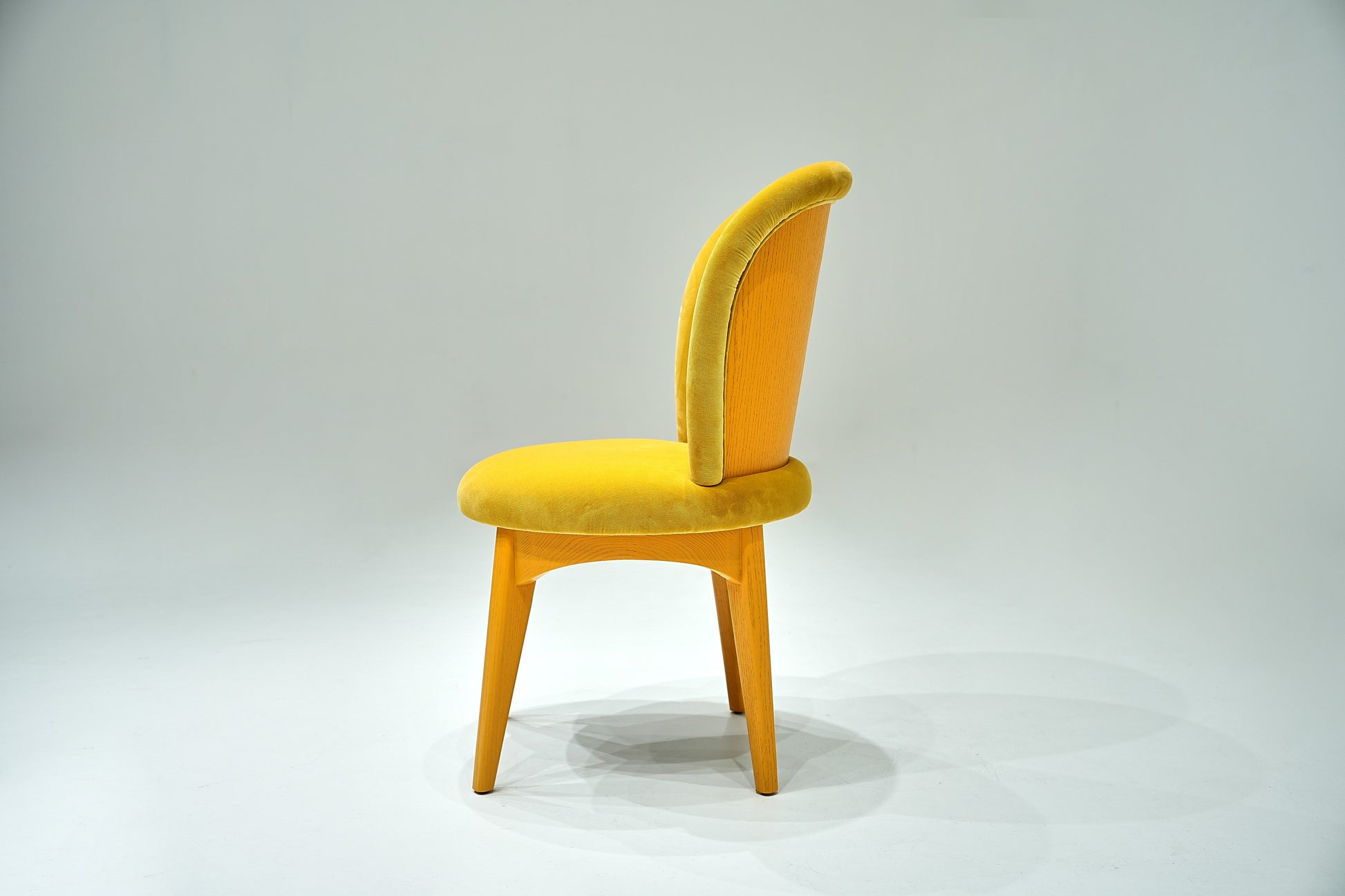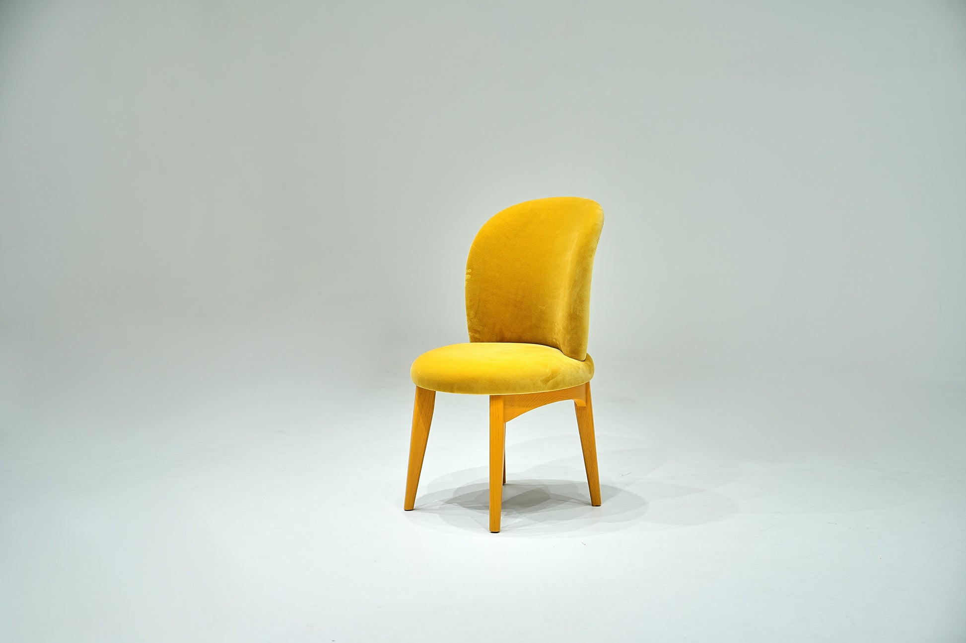 Designed by Cristina Celestino Studio, the Ottavia chair echoes Rome's signature architectural elements both in form and function. Showcasing simple geometries and soft lines, the piece is characterised by the arch-shaped legs in lacquered wood, inspired by Palazzo della Civiltà Italiana, and a curved wooden back engraved with the FF logo that seems to naturally unfold around the body. Upholstered for maximum comfort, this sophisticated design is ideal for both living and dining areas.
