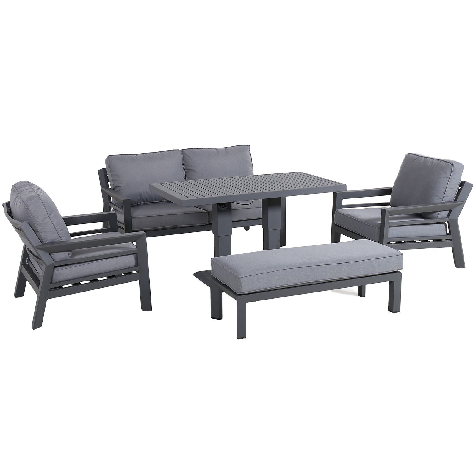 Complemented with a gas-assisted lift table. this striking outdoor seating set boasts shower-proof cushions and a slatted tabletop for rain repellance.
