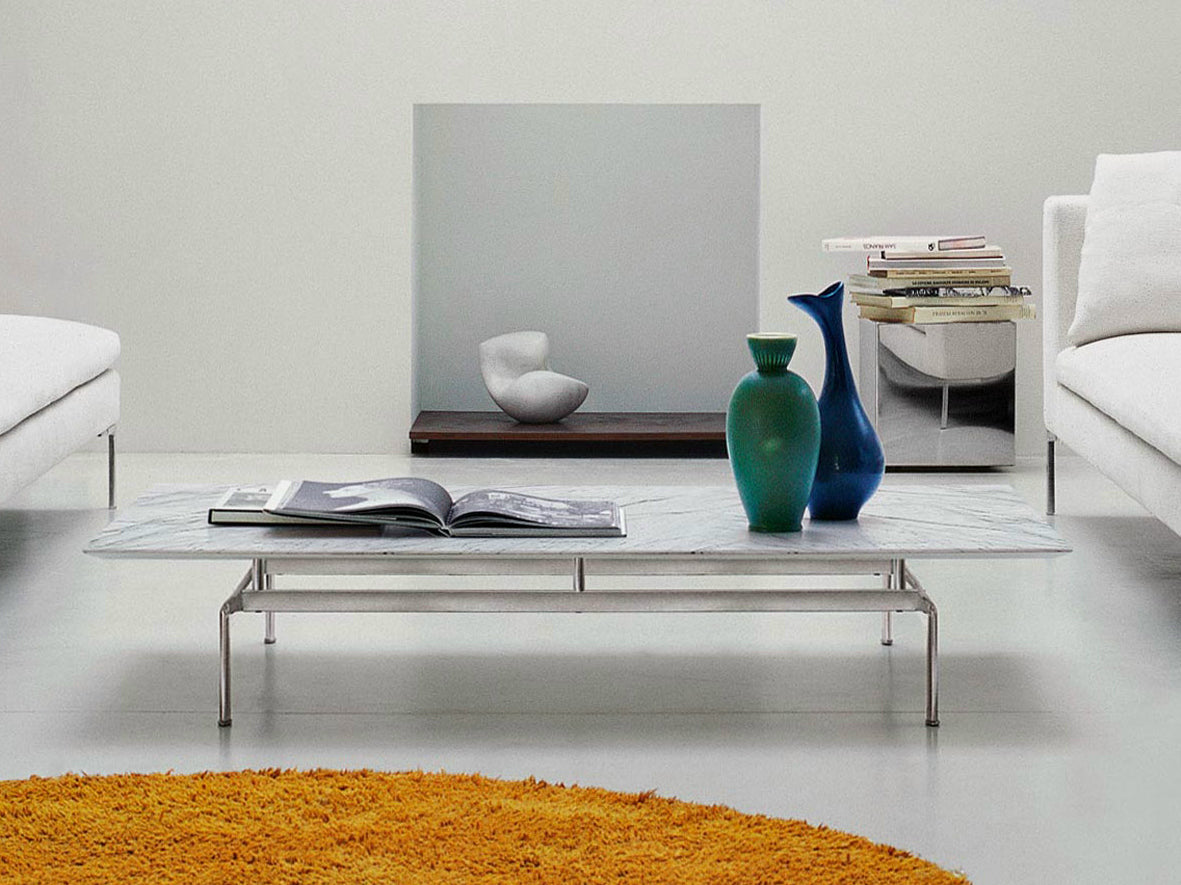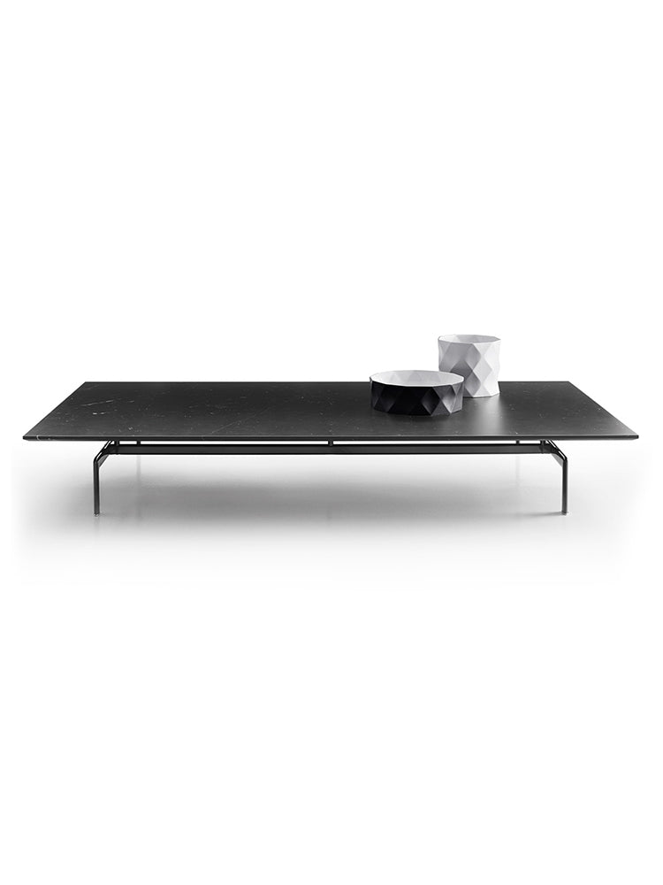 description | An evergreen like the sofa, which inspires its die-cast aluminium supports. Three versions, two impressive even in term of size; the other lighter with two tops, one in transparent ground glass and the other covered with thick leather. |