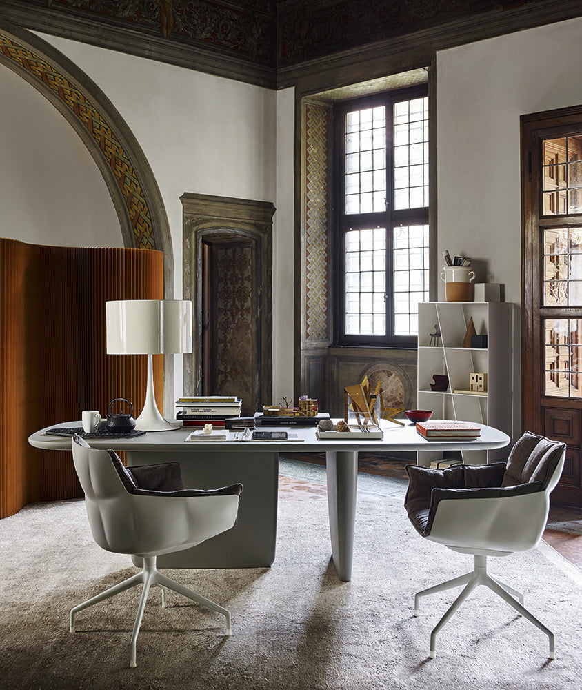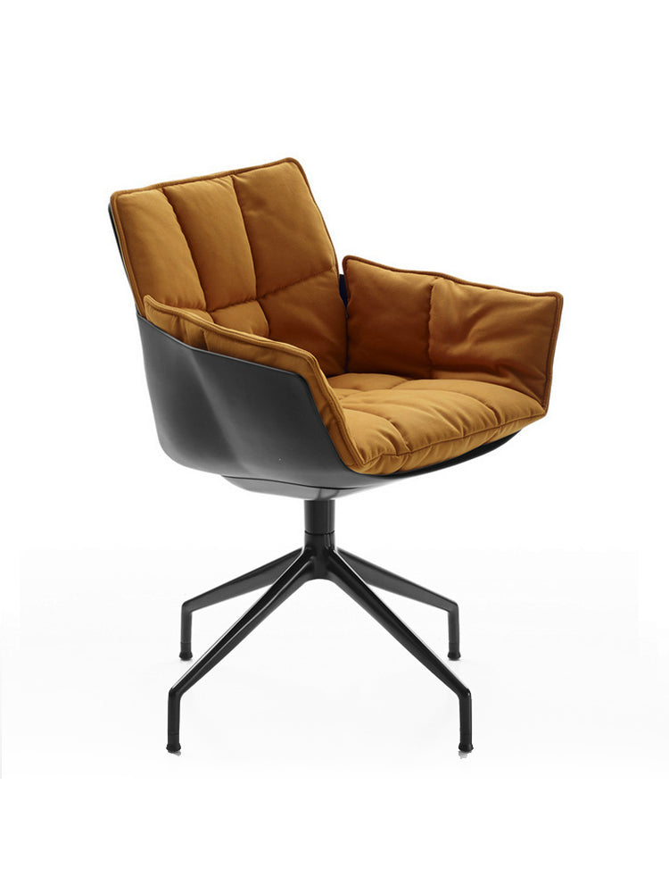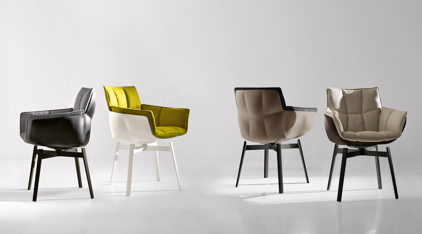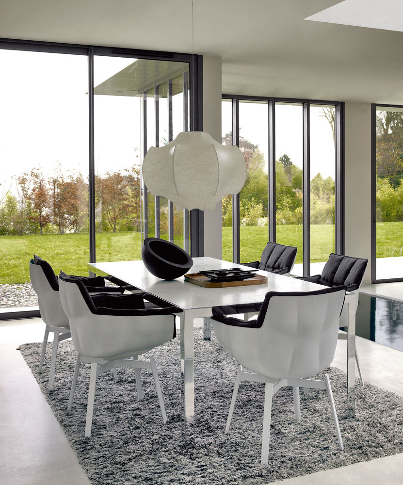 description | Comfortable, with a modern combination of base and seat, it picks up the profile of the namesake armchair. The body, which is shaped with a design that cites the capitonné style, conveys a feeling of softness; the cushions, in fabric or leather, fixed with press studs, are distinguished by the quilting. Many colour variants and combinations. |