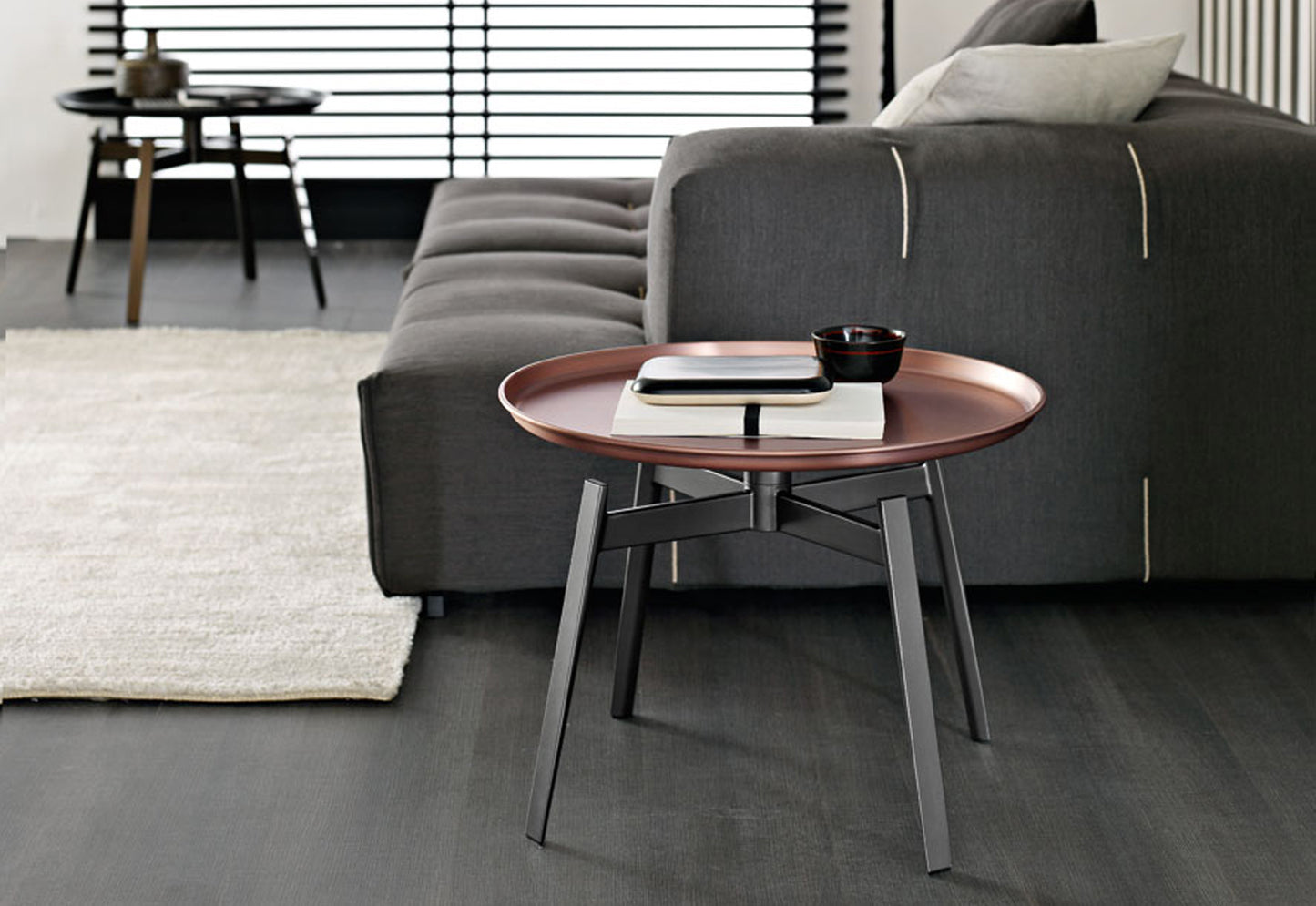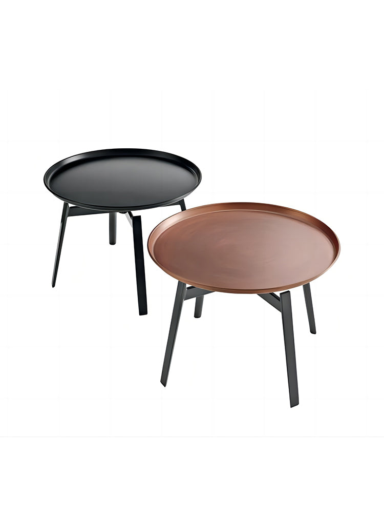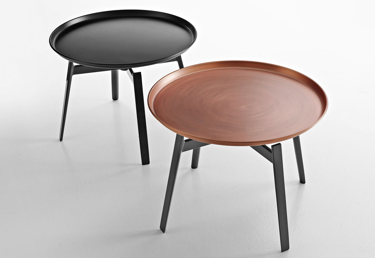 description | Designed to accompany the Husk bed, it is useful in domestic environments with its design based on a circular metal tray lightly resting on solid die-cast supports. Painted white or black, the top also has a copper finish as homage to an ancient material that was once associated with classical aesthetics, and which has been revisited today with modern sensitivity. |