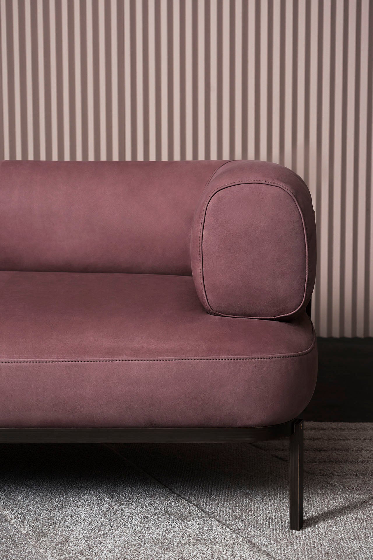 description | Belt is a leather sofa, designed by Federico Peri. Patinated bronze-varnished metal frame. Seat and back frame in birch plywood. Differentiated density polyurethane foam filling with acrylic fibre cover. Back belt with central part covered with leather and satin brass terminal stops. Seat and back cushions available in soft leathers only. Back belt available in all leathers indicated in the catalogue; it should be remembered that the price is set by the category the cushions’ leather belongs to. |