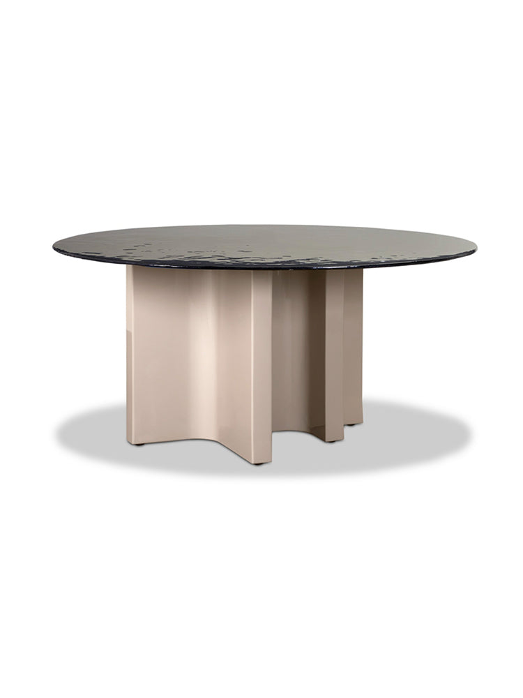 description | Dharma is a garden tavle with glossy lacquered polimex base. Adjustable feet. Bronze colour or smoked color fused glass top, carried out with a particular technique aimed to obtain imperfect surfaces. Top supporting in dark grey-powder varnished 316 stainless steel. Top available in bronze or smoked colour. |