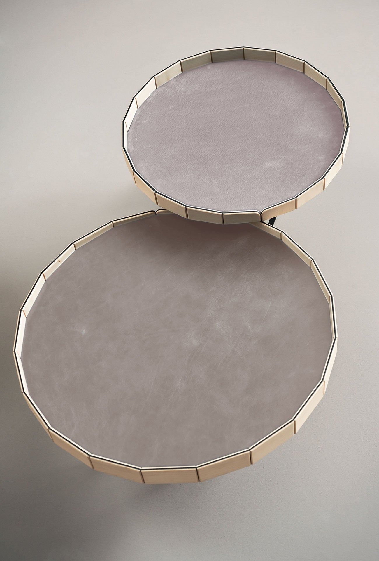 description | NINFEA is a leather small table designed by Pietro Russo. Small table in black metal base with brass feet. Carried out through a folding-working of a panel, obtained by pressing one each other battens of solid maple wood, black-stained leather and again battens of solid maple wood. Surface top in wood, like the structure, or with additional leather-covered panel. Two maple finishes available: natural or dyed with black aniline. |