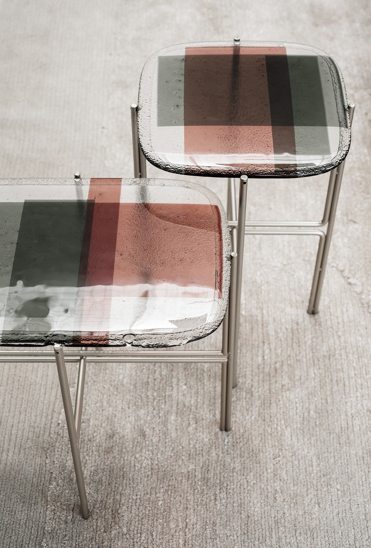 description | TETRIS are coffee tables design by Draga&Aurel. Legs in satin brass-coated or in satin nickeled metal, with clear matte varnish. Artistic fused glass top, made of Murano glass with coloured glass inlays arranged in 5 layers. 800-degrees fusion that melts the layers in a single solid glass top of 20 mm thickness. Available in blue or pink. Surfaces created by hand as “pictures”; each item will therefore be different and unique. |