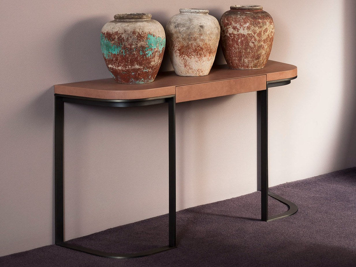 description | YVES is a leather consolle designed by Roberto Lazzeroni. Base in satin brass-coated metal, in hand-finished burnished metal or in satin nickeled metal, with matte varnish. MDF frame with leather upholstery. Little drawers in India rosewood with matte finishing and decorative structure in metal. |