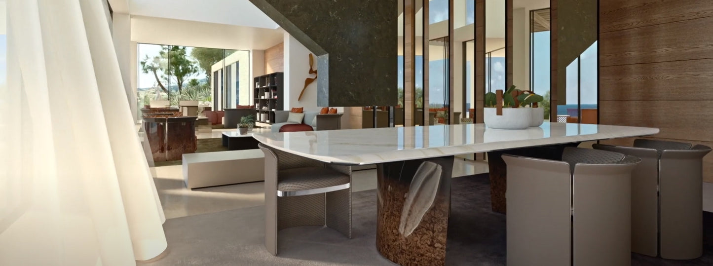 description | Design and art come together in the lines of the Aldford table, presented in a choice of rectangular or circular versions. An organic, seductive design, enhanced by the three layers that make up the top: the underside is lacquered in a glossy black, a metal profile runs around the perimeter, while the upper surface is in marble or glossy brushed wood. Legs in veneered Smoked Liquidambar or Burr Walnut briar-root, or alternatively covered with leather. The top is available in Calacatta or Valentine Grey marble, or veneered Warm Grey Fiddleback Sycamore, Smoked Liquidambar or Burr Walnut briar-root. |