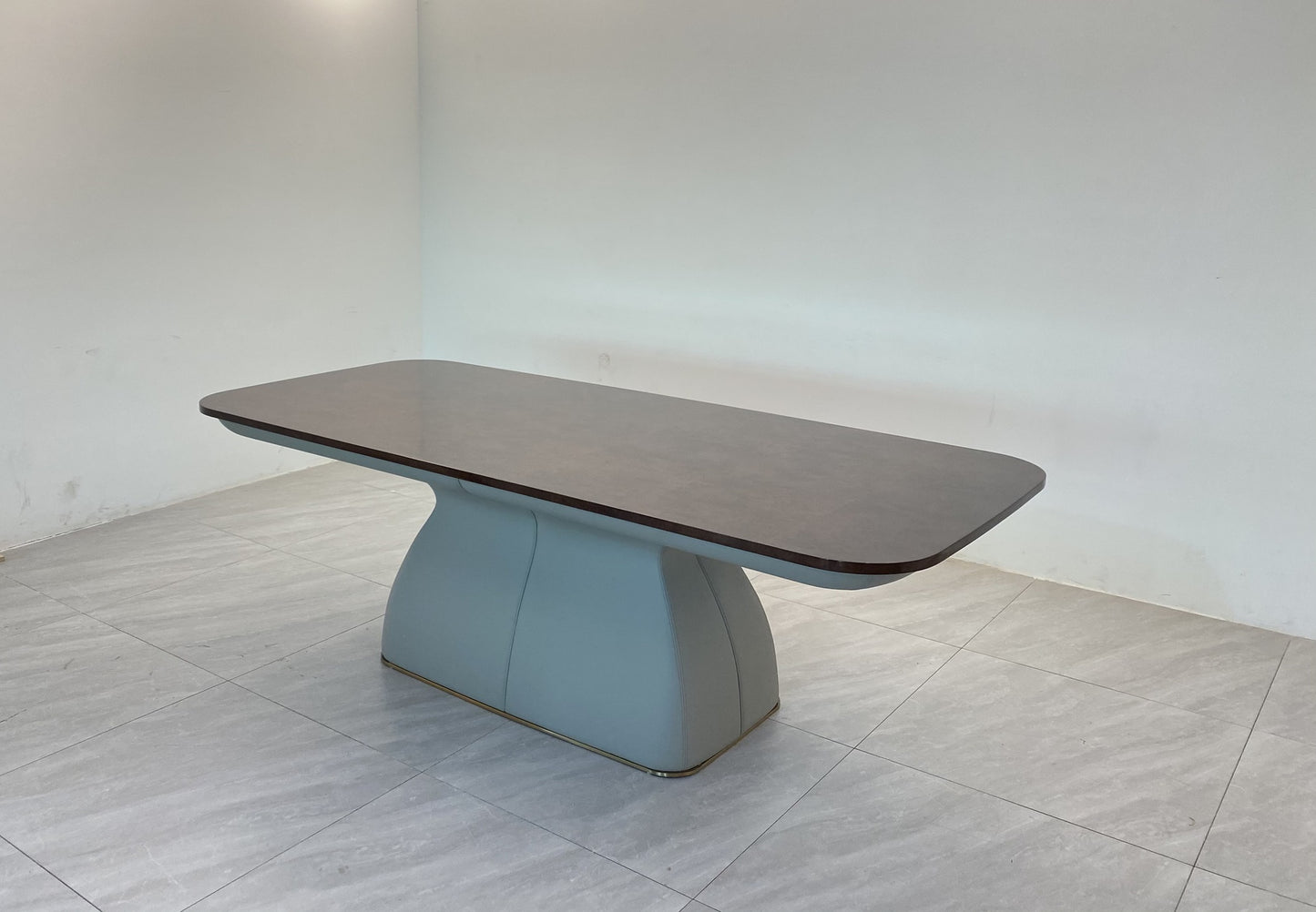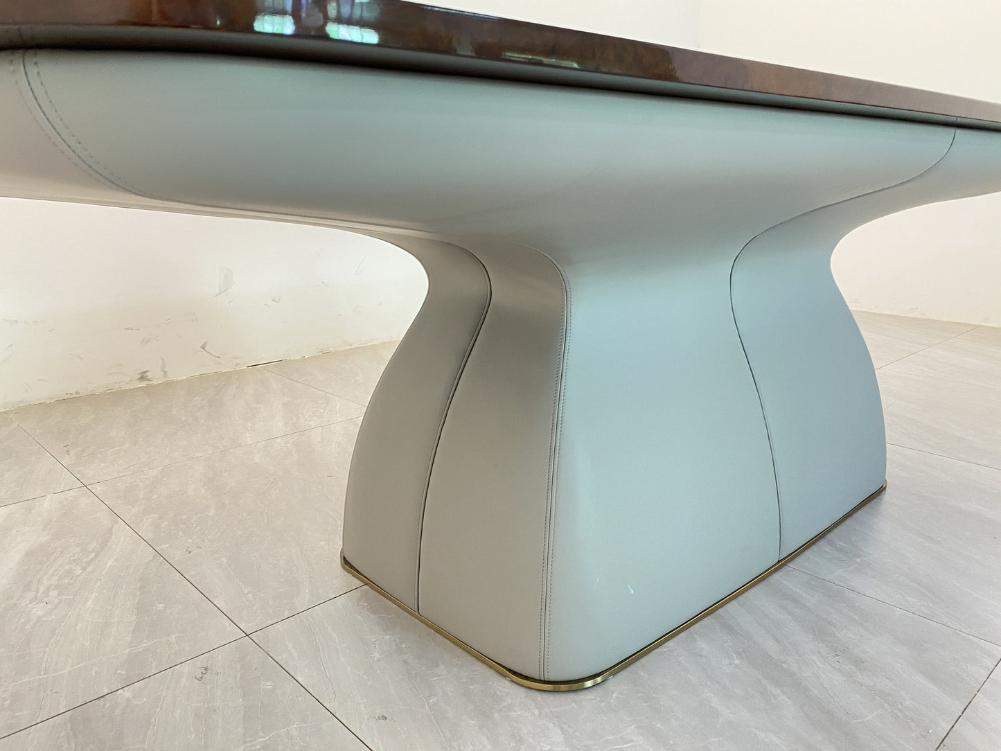 description | The impressive Alston table is characterised by a juxtaposition of different shapes and volumes. Top venereed Warm Grey Fiddleback Sycamore or Burr Walnut briar-root. Under top matt lacquered coordinated with the leather base. |
