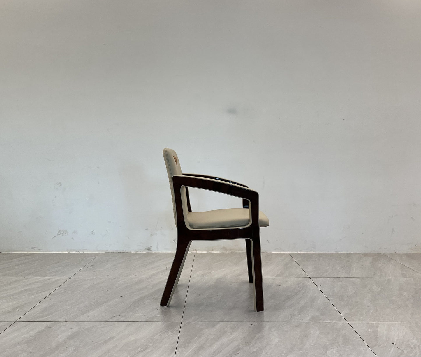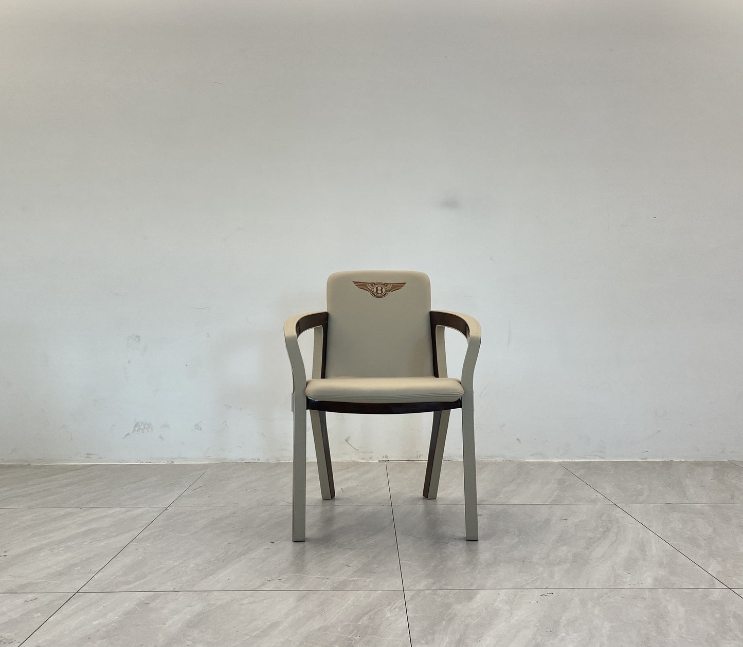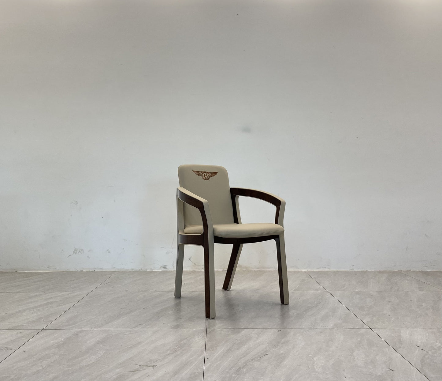 The frame, veneered Warm Grey Fiddleback Sycamore or Burr Walnut briar-root, is in enhanced by the leather profiles. Back with logo embroidery. |