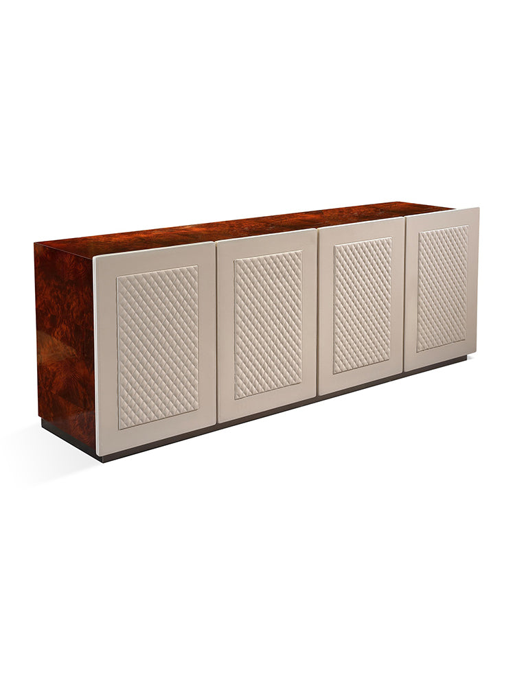 description | The DNA written into Bentley tradition is clearly present in the impressive Kensington living room furniture. The sideboard has the graceful lines of a thoroughbred, with the frame in the same Ebony Macassar or burr walnut used to handcraft the interiors of the iconic Bentley cars. The doors are tastefully covered in soft leather, with smooth leather acting as a frame around the central diamond-shaped tuft pattern. |