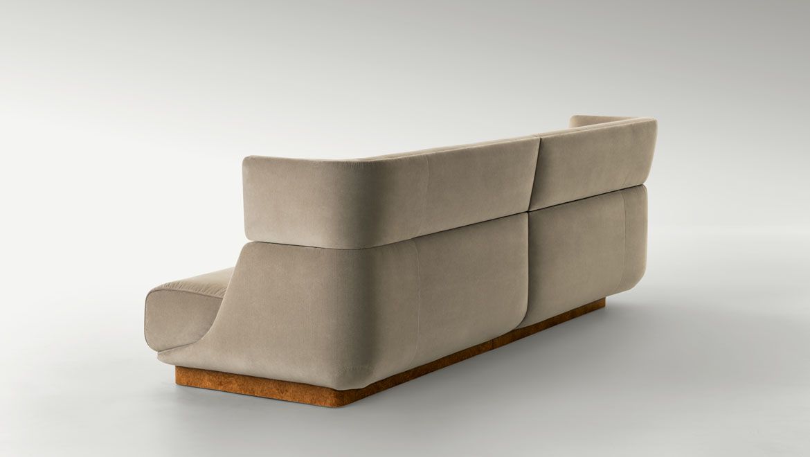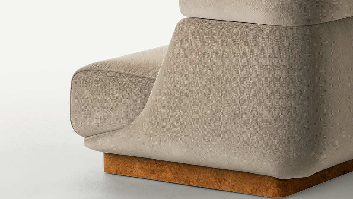 description | Lancaster proposes to make a high-impact piece of furniture which steals the scene while simultaneously is an island of both acoustic and visual intimacy. The sofa acquires an architectural dimension, offering a chance to live a comfortable, cosy experience. It is presented with a chevron fabric upholstery and briar root base. |