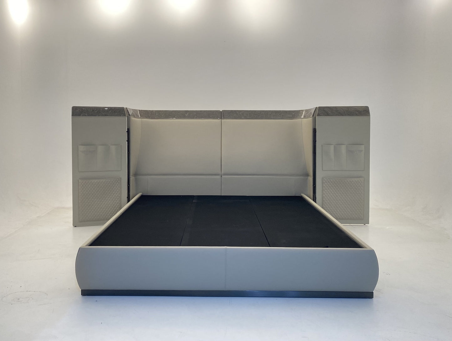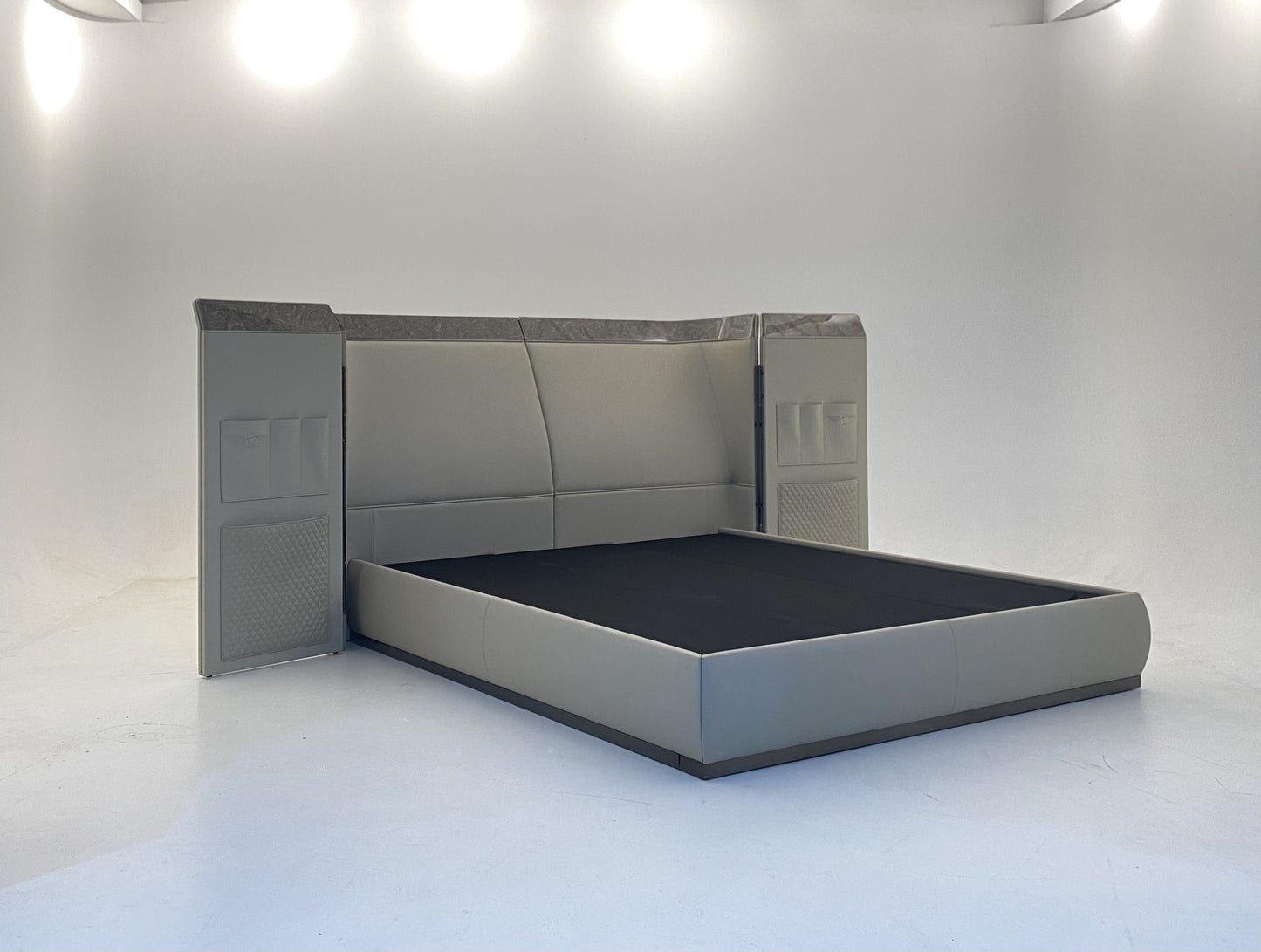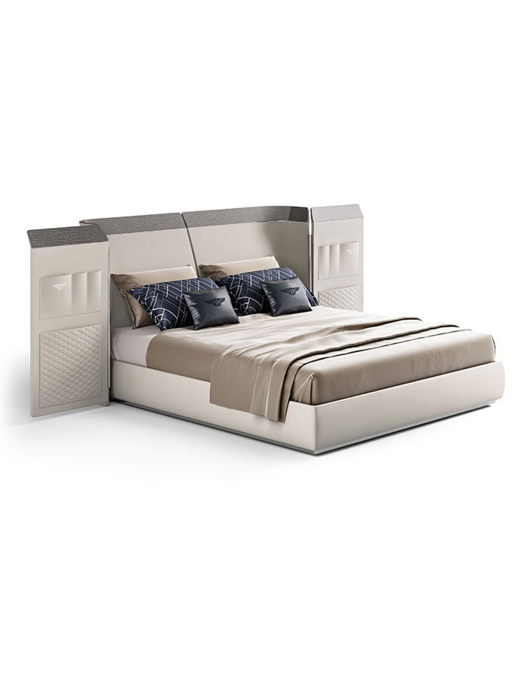 description | The Ramsey bed is a tribute to the famous flying wings of the maison. The headboard is available in veneered Warm Grey Fiddleback Sycamore, Smoked Liquidambar or Burr Walnut briar-root. Alternative version completely covered in fabric or leather. Lateral sides with steel hinges, gun-metal grey finishing. |