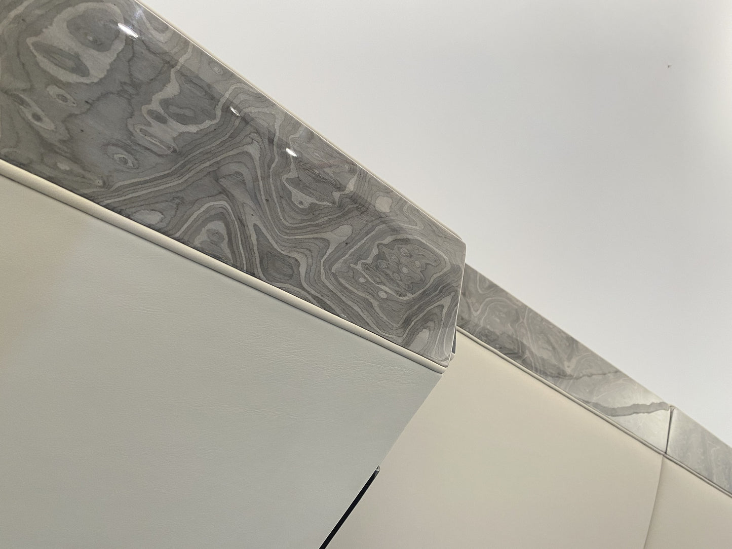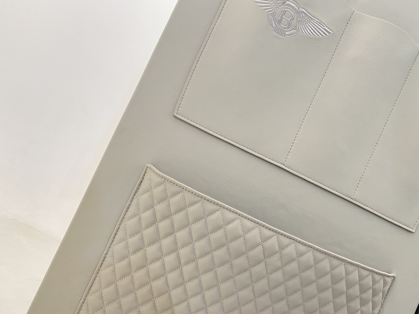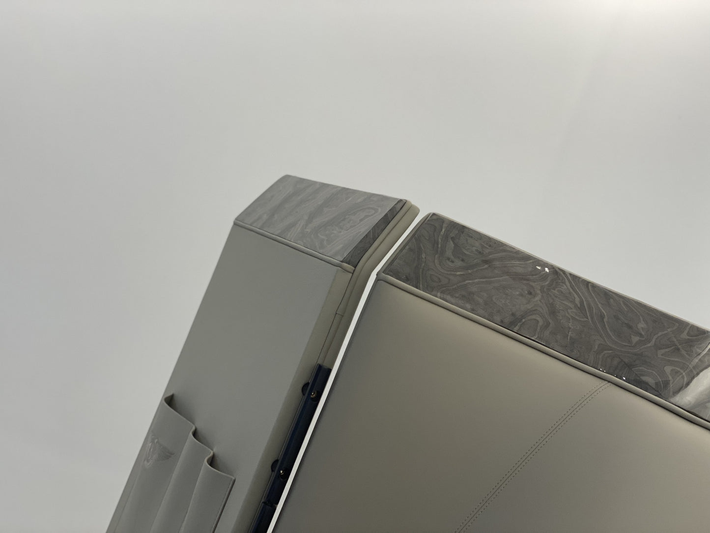 description | The Ramsey bed is a tribute to the famous flying wings of the maison. The headboard is available in veneered Warm Grey Fiddleback Sycamore, Smoked Liquidambar or Burr Walnut briar-root. Alternative version completely covered in fabric or leather. Lateral sides with steel hinges, gun-metal grey finishing. |