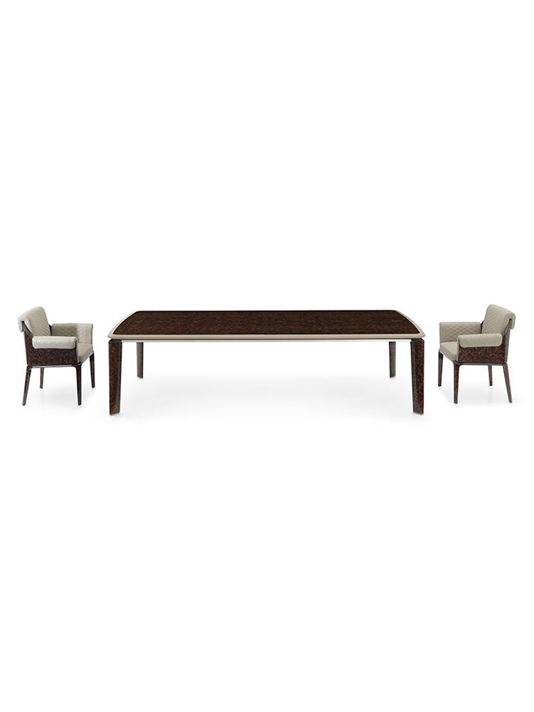 description | The elegant, linear Sherwood table is embellished with steel details in gun-metal grey finishing. The top, veneered Warm Grey Fiddleback Sycamore or Burr Walnut briar-root, features a shaped edge covered in leather. Alternative version with tempered extra clear glass top, back lacquered. |