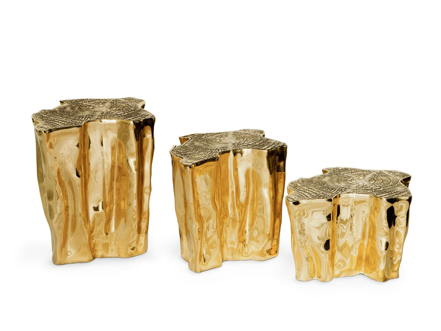 description | The mystic behind the name inspires Eden. A slice of the tree of life that fell from the Garden of Eden, this accent coffee table set awakens desire and curiosity with its intriguing cut. Born from master artisans and the ancient technique of polished cast brass, these statement design pieces incorporate nature-inspired design with industrious welding techniques, being manually assembled, making each piece unique. With delicate lines and bold details, a manually engraved top exposes the heart of a golden tree, boasting a sinuous gold plated base that stood the test of time. It is available in groups of 7, 8 or 14 pieces, with different heights, for unexpected combinations. The remarkable and already time-honoured piece, Eden coffee table series combine with both contemporary and modern design styles, classy rooms waiting for superior craftsmanship and iconic design. |
