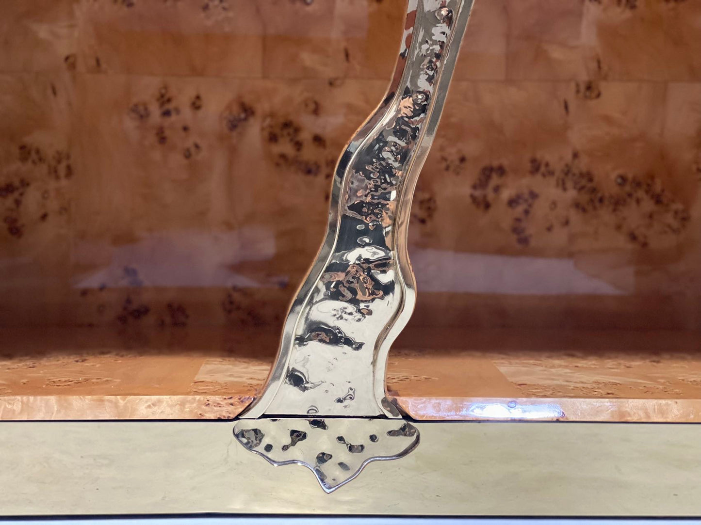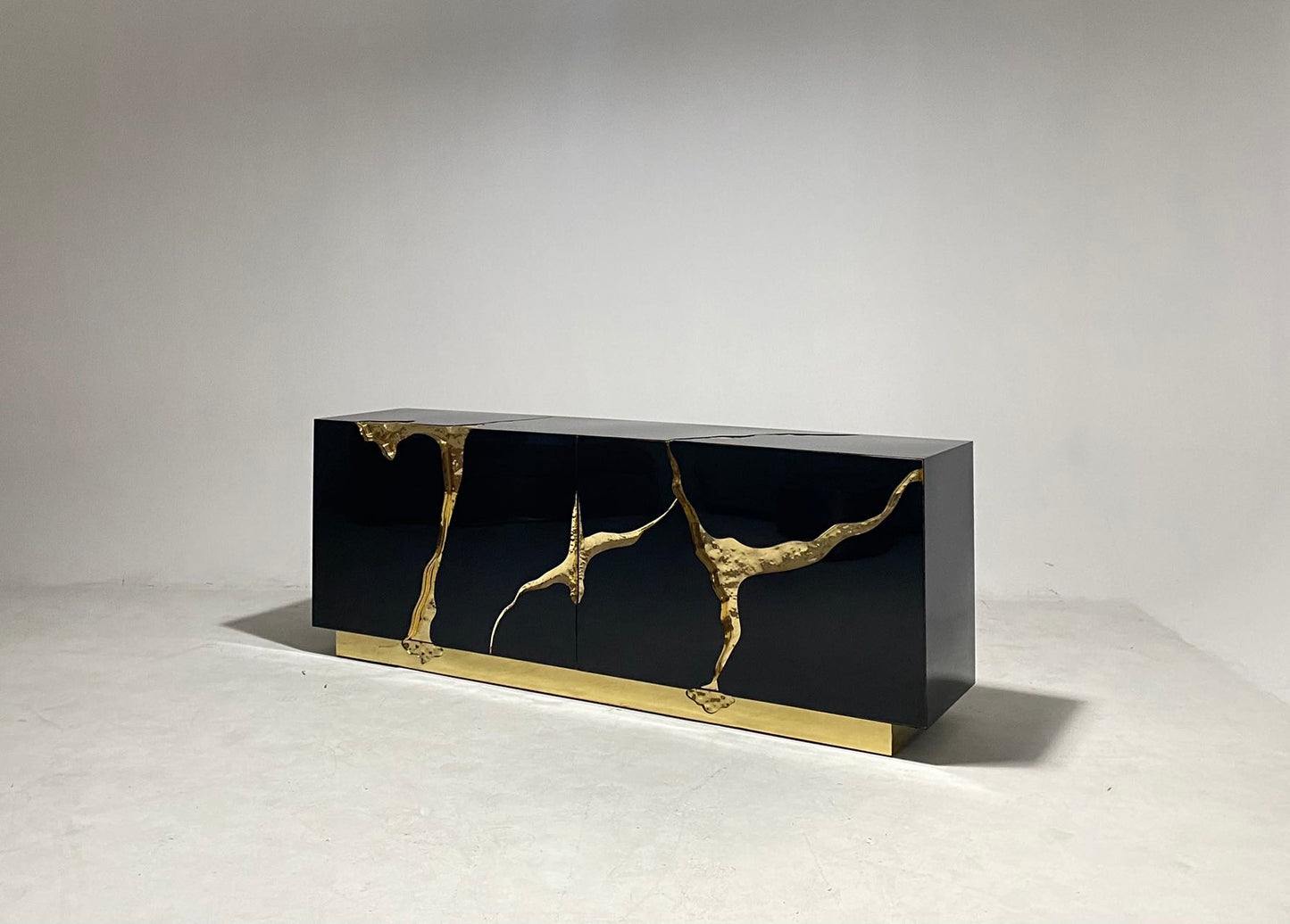 description | Lapiaz sideboard takes exceptional craftsmanship and design to a new realm. Finding beauty in the most unexpected places, this contemporary design piece is inspired by authentic karst formations. Its organic features are achieved through the manual fitting of polished brass, and a sharp finish in polished stainless steel that portrays a perfect mirror. Different-shaped doors and drawer open to a distinct poplar root wood veneer interior. The hammered gold details and the mirrored façade conveys both dynamics and elegance, a beautiful duality between power and refinement to bring a new contemporary verve into interior design. A functional artwork piece born from cold and freshly cracked to showing off the world rich, golden details. |