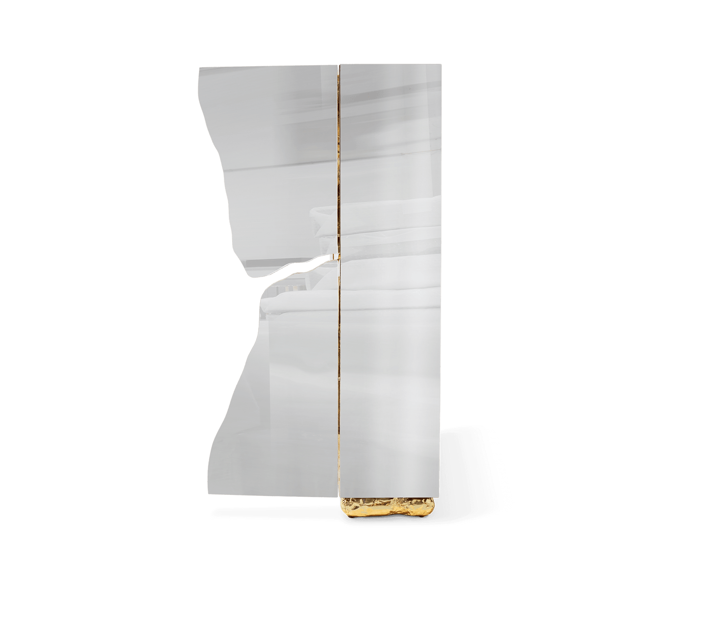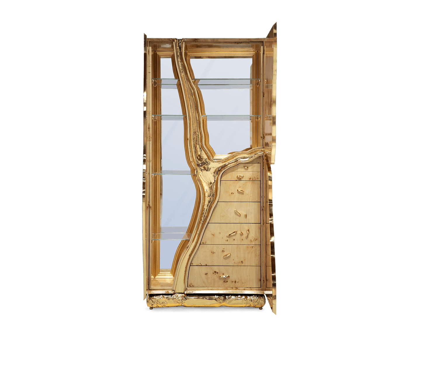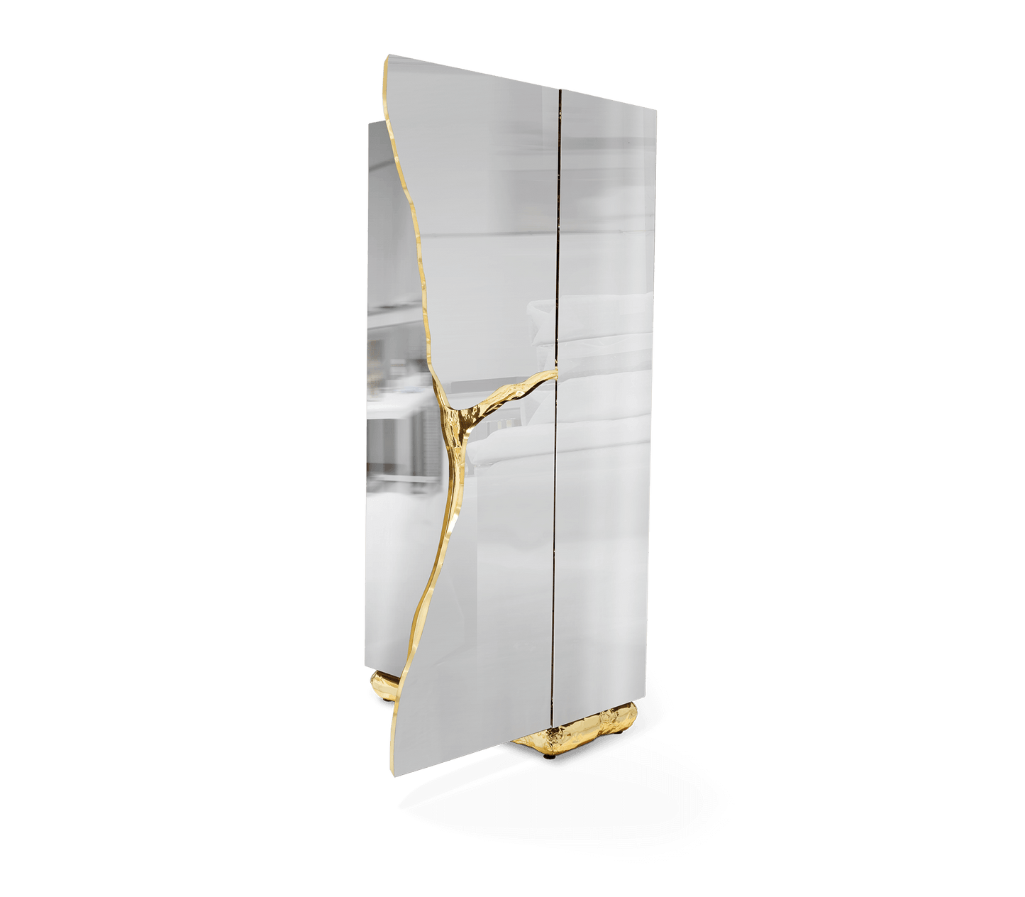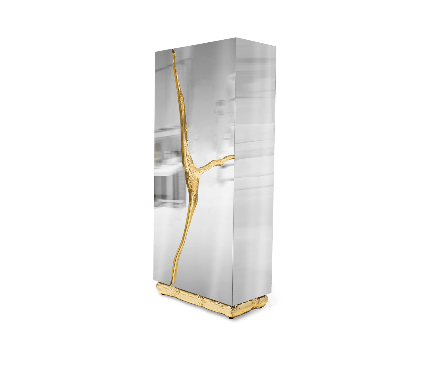 description | Lapiaz cabinet takes exceptional craftsmanship and design to a new realm. Finding beauty in the most unexpected places, this contemporary design piece is inspired by authentic karst formations. Its organic features are achieved through the manual fitting of polished brass, and a sharp finish in polished stainless steel that portrays a perfect mirror. Different-shaped doors and drawer open to a distinct poplar root wood veneer interior. The hammered gold details and the mirrored façade conveys both dynamics and elegance, a beautiful duality between power and refinement to bring a new contemporary verve into interior design. A functional artwork piece born from cold and freshly cracked to showing off the world rich, golden details. |