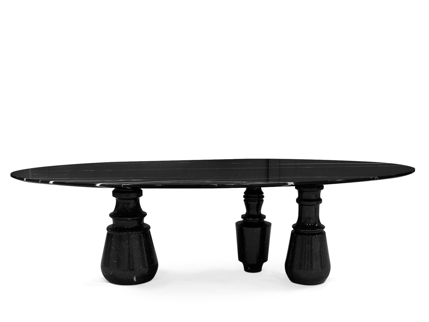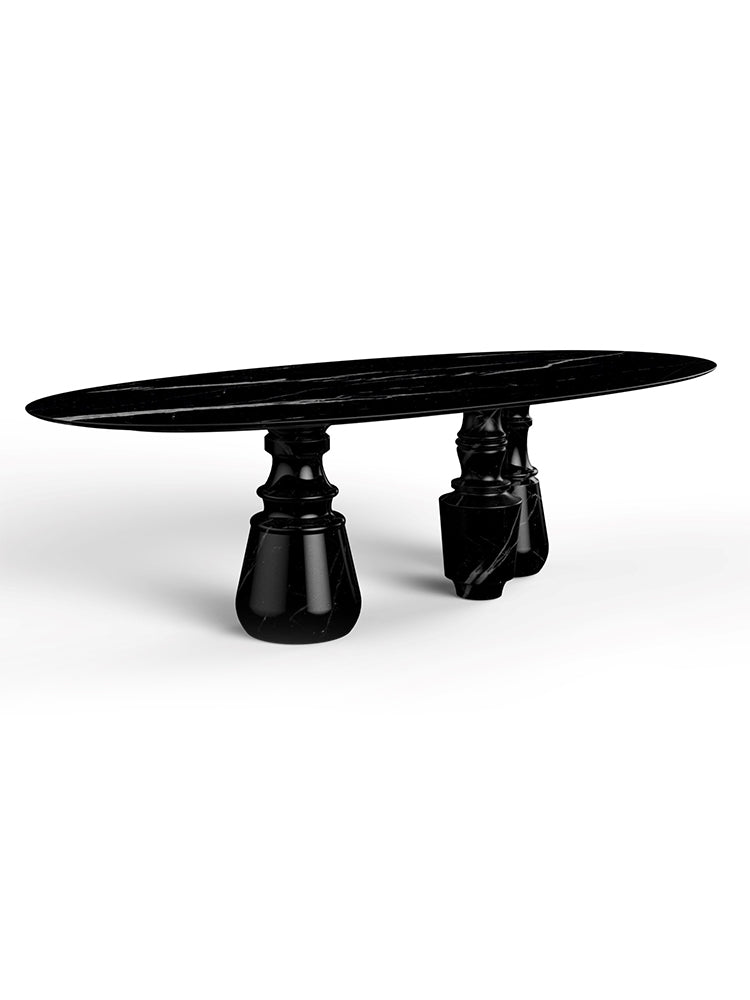 description | Playing with function and sculptural form, Pietra dining table shapes a timeless experience through its classical aura and finest Nero Marquina black marble. Reminding the renaissance era, its oval top gently lies in three robust marble columns, each one conceived from solid blocks hand-sculpted and turned to create different details for additional texture. A noble material carved in Boca do Lobo workshops, conceiving a soulful statement dining table ideal for elegant and refined dining rooms. Designed for eight seats, the contemporary feel of Pietra is effortlessly stylish and it is suitable for indoor or outdoor use. |