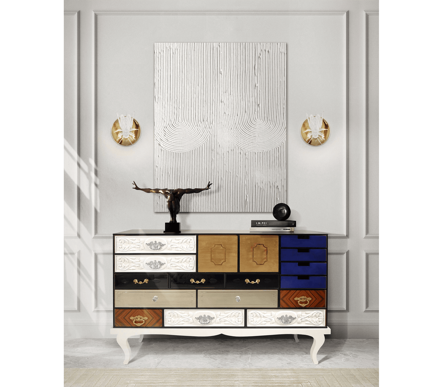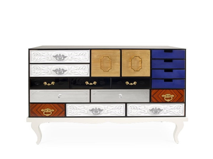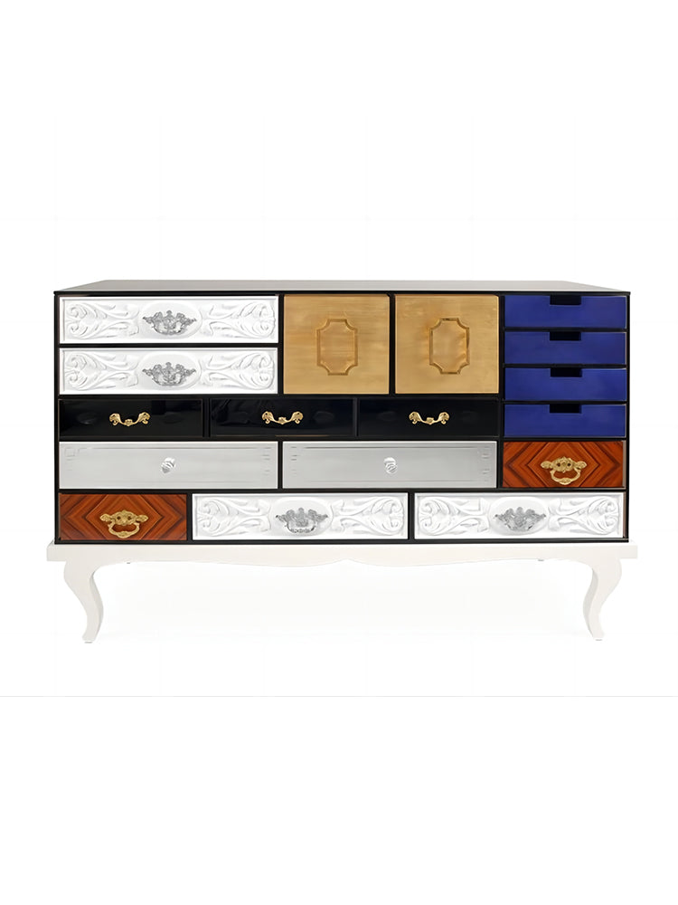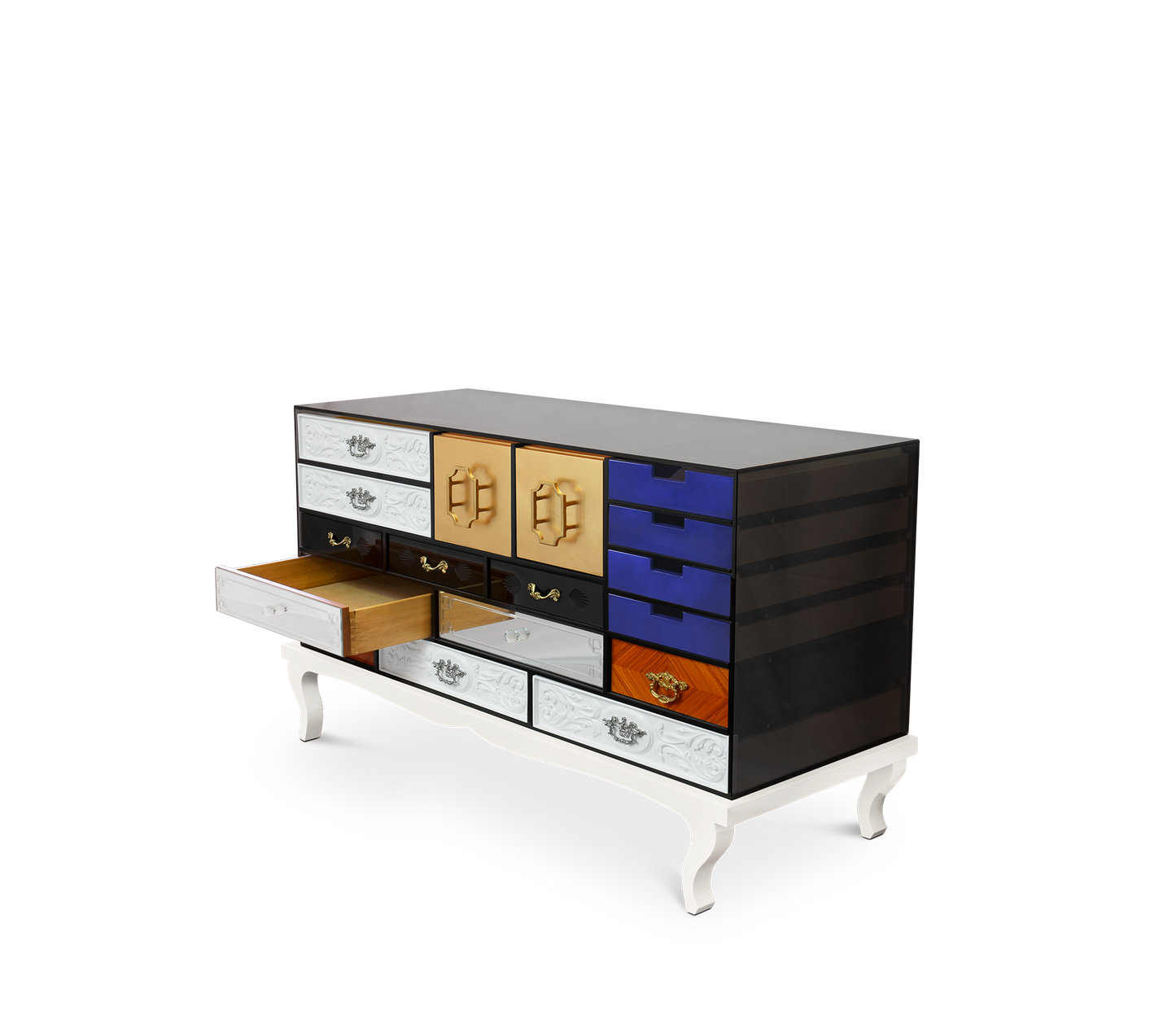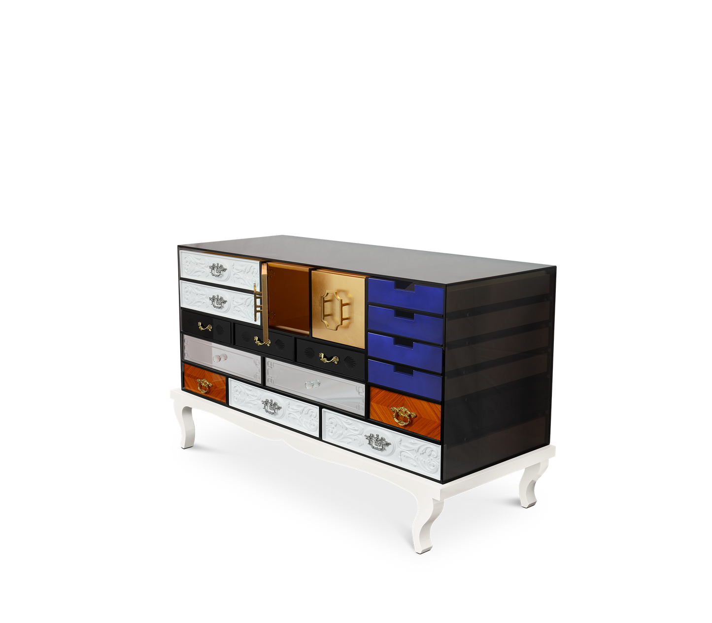 description | SOHO sideboard named the first collection of Boca do Lobo, boosting its first international steps. It was presented for the first time in London, one of the biggest and international stages of design. The attitude and irreverence reflected by this piece made it an icon, never unnoticed in any part of the world. Drawers that count different and varied techniques from glass to wood, lacquer color to mirror and gold leaf compose this contemporary sideboard, finely refined by brass handles. Boca do Lobo's SOHO modern sideboard is an exquisite work of art and one of our best sellers. |