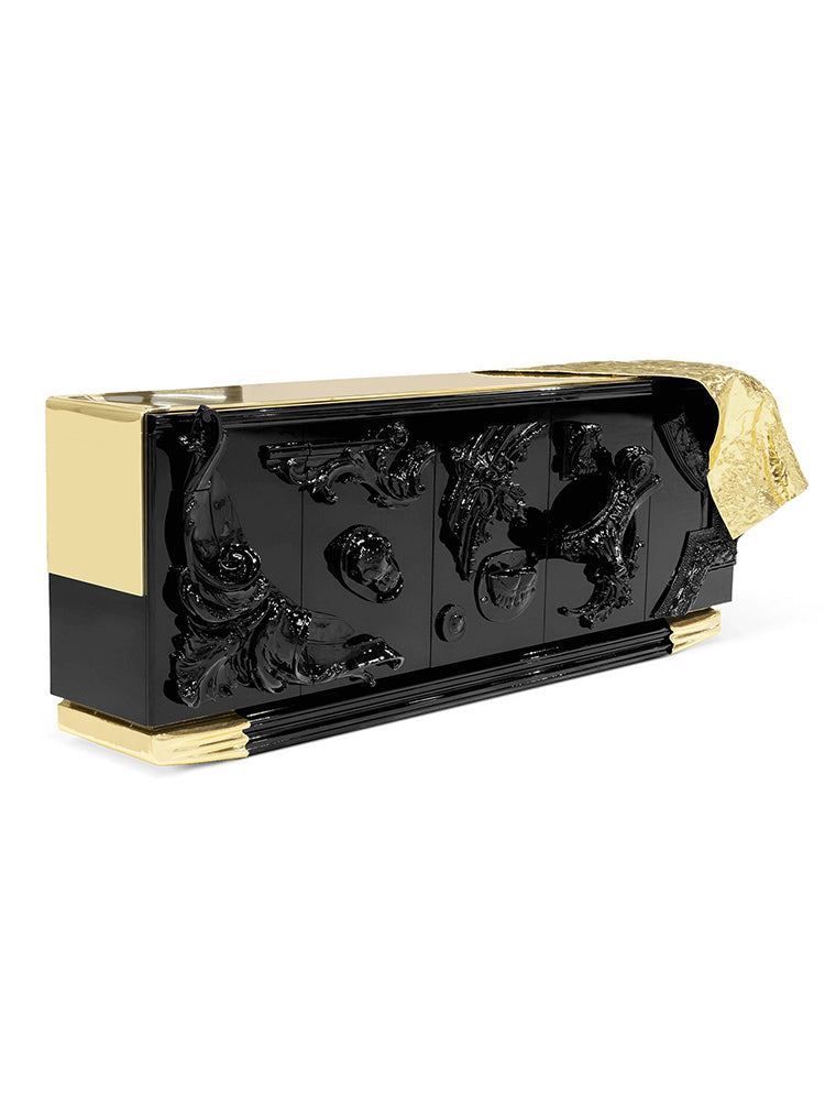 description | A contemporary sideboard enveloped by manually sculptured panels with decorative elements finished in high gloss black lacquer. The statement twist lies on the asymmetrical hand-hammered fitting of a golden polished brass sheet on the right side of the top, and base detail. Four doors carry the sculpted black elements into its interior, opening to a striking bronze mirror on the back, and one glass shelf. The statement sideboard was conceived to enrich any living space, a masterpiece that carries centuries of history and finest craftsmanship into a contemporary design. Inspired by the French Court’s greatness and splendour of the XVII century, it depicts the architectural and artistic landmarks of the age, alongside, it pays tribute to an era of great thinkers. Known for his ideals of a free and liberal society, Voltaire has become synonymous with the ‘Enlightenment’ due to the philosopher's extraordinary wit, and his deist beliefs, not by faith, but rather by reason. |