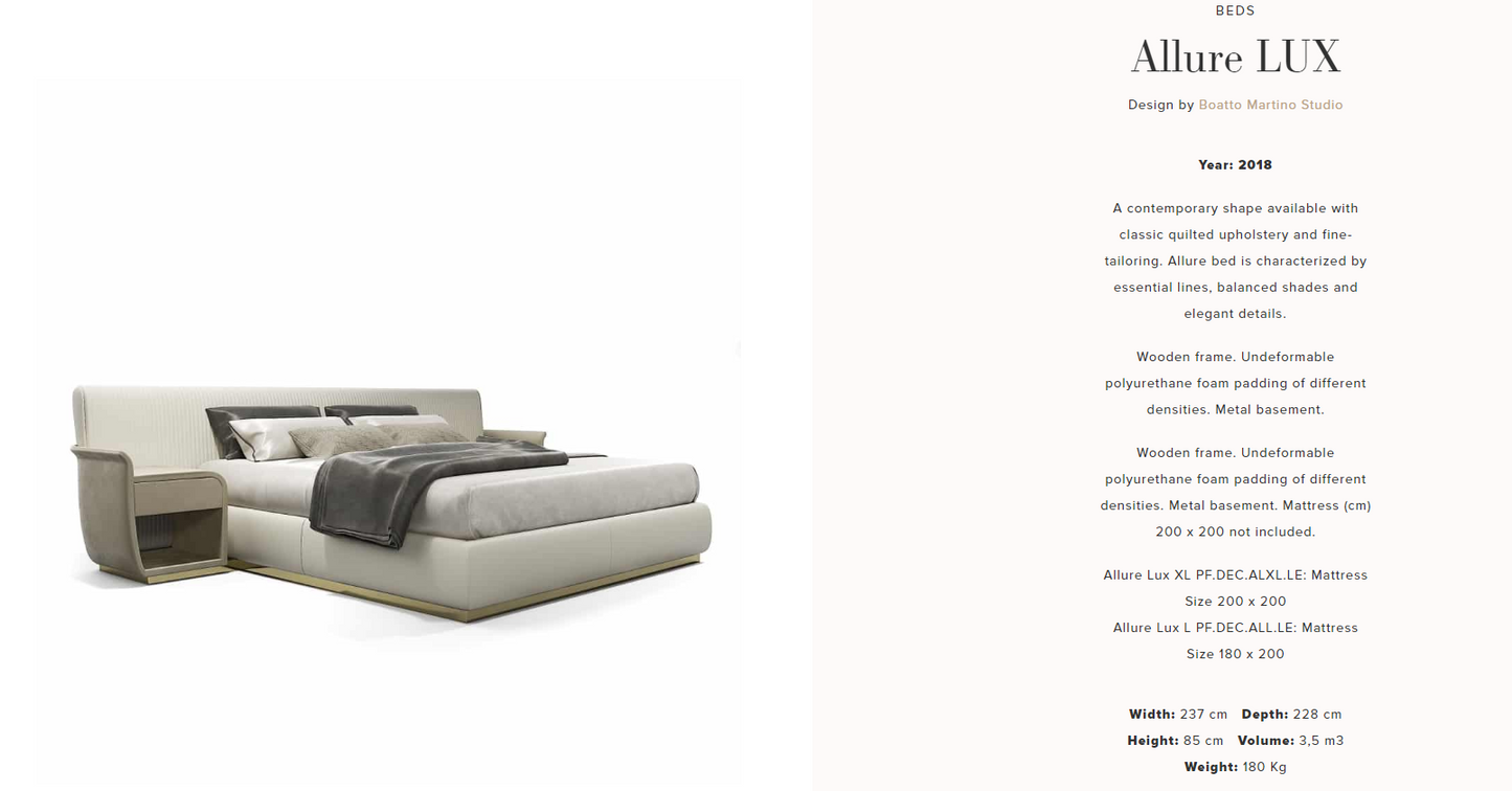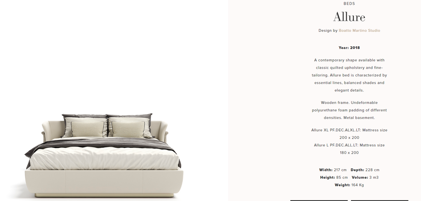 description | A contemporary shape available with classic quilted upholstery and fine-tailoring. Allure bed is characterized by essential lines, balanced shades and elegant details. |