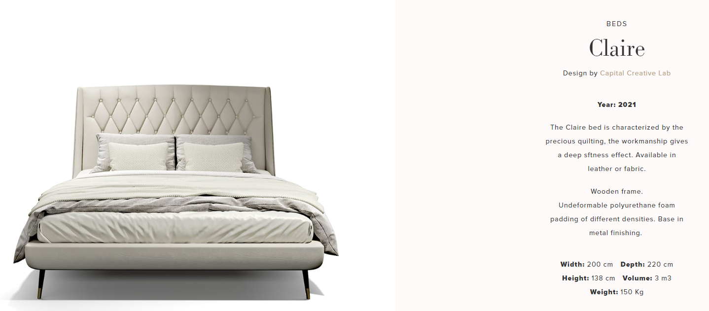 description | The Claire bed is characterized by the precious quilting, the workmanship gives a deep sftness effect. Available in leather or fabric. |