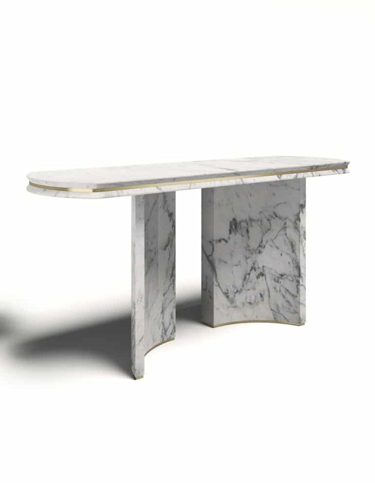 description | Developed starting from a pure marble bock, the Ercole family of complements reveals great versatility through its clean and simple shapes. Marble top and base. Central insert and details in metal finishing. |