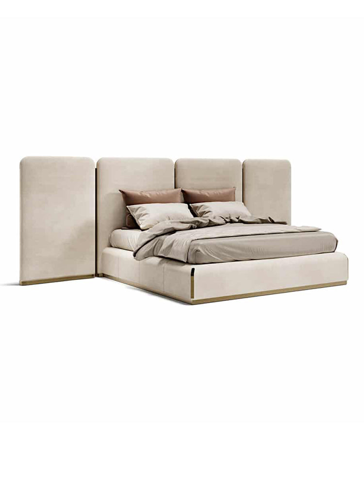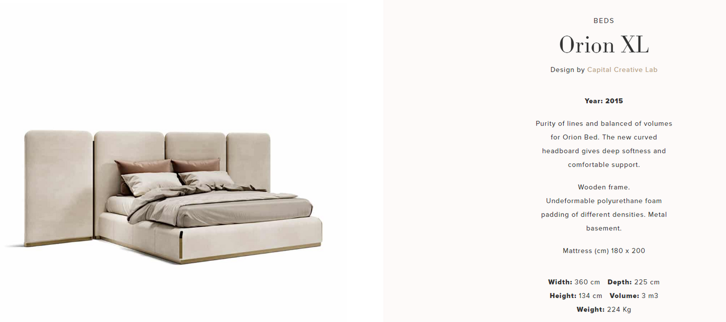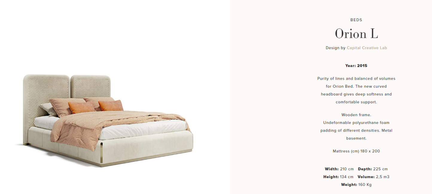 description | Purity of lines and balanced of volumes for Orion Bed. The new curved headboard gives deep softness and comfortable support. |