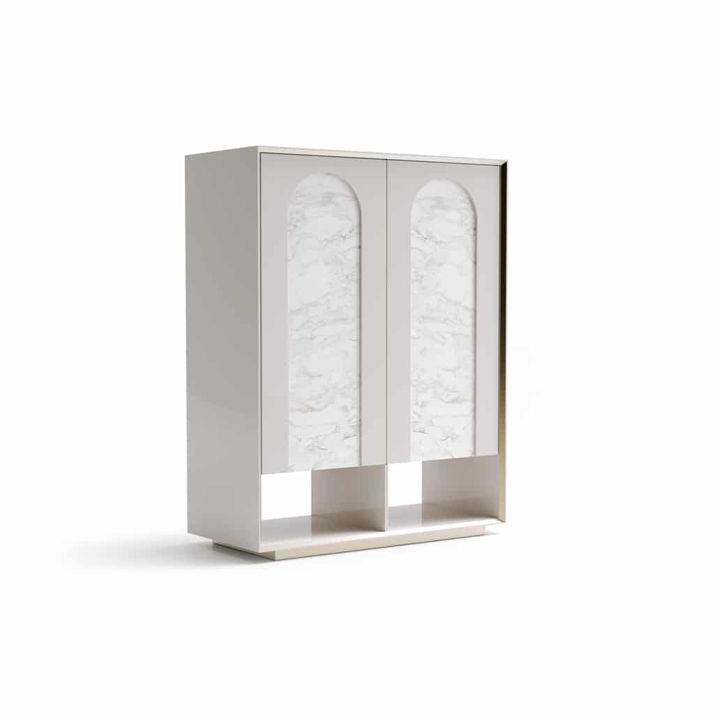 description | Lacquered structure. 4 doors. Decorative arches on lacquered doors. Metal profiles and details. Base in metallic finish. Internal shelves in tempered glass. Optional internal LED. |