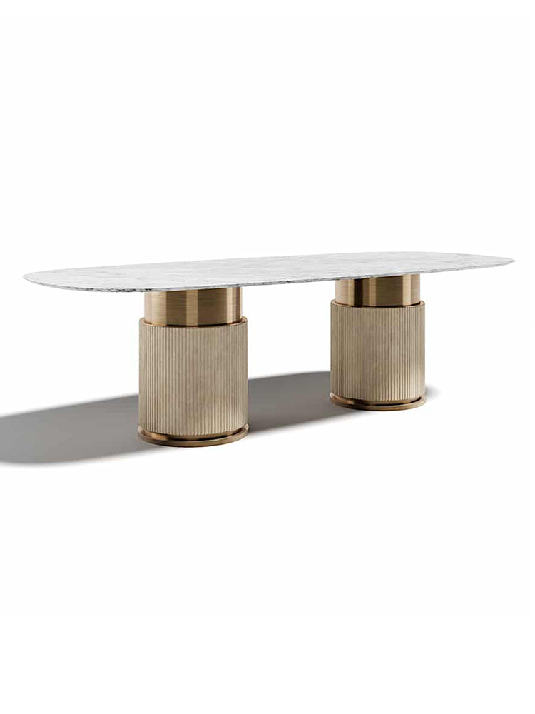 description | The cylindrical bases of Rock Oval table features a crown on its structure in metal finish. The leather upholstery or fabric of the frame is complemented by a wooden or marble top. Wooden frame. Metal profiles and details. Base upholstered with leather. |