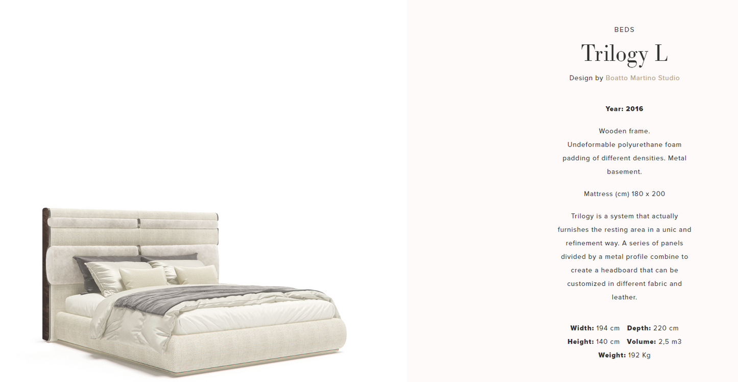description | Trilogy is a system that actually furnishes the resting area in a unic and refinement way. A series of panels divided by a metal profile combine to create a headboard that can be customized in different fabric and leather. |