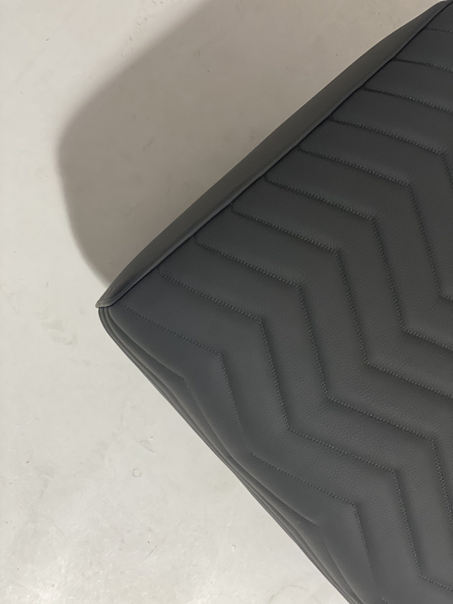 description | The deliberately clean design, in the shape of a parallelepiped, defined by a large volume, spotlights the chevron-patterned stitching that characterises the bench covering.The bench is available in two versions: Quincy, covered in fabric or leather, and Quincy Chevron, only in leather with stitching. The decorative pattern, which draws a series of stitched “V”s, wraps Quincy Chevron up in an interesting three-dimensional effect, highlighting the esprit couture of sartorial craftsmanship combined with bold, linear shapes. It is available in three sizes, in Nabuk and all the leathers and fabrics of the collection. It sits on brushed aluminium blades with polished varnished Brandy colour finish, that contrasts yet complements the texture of the covering. |