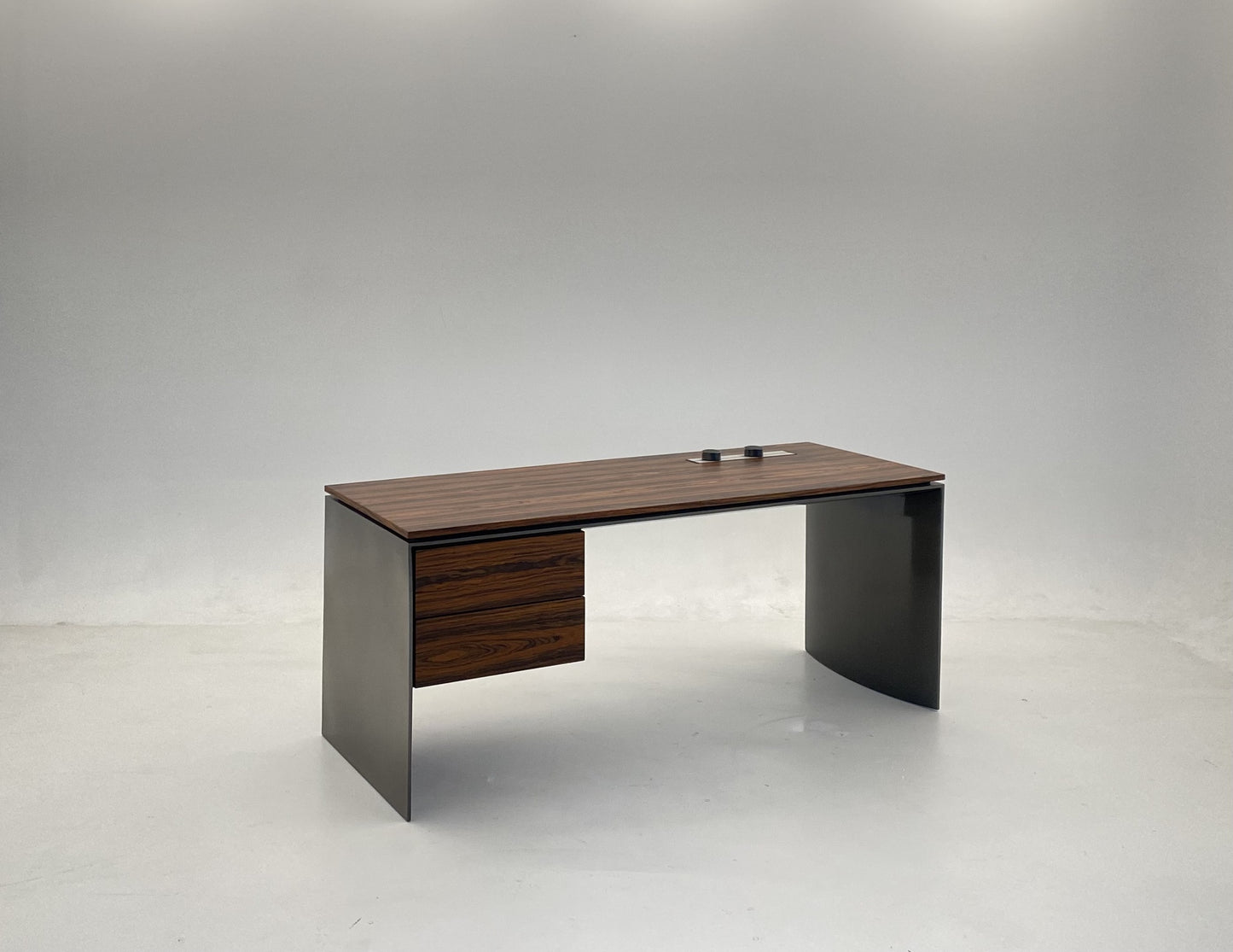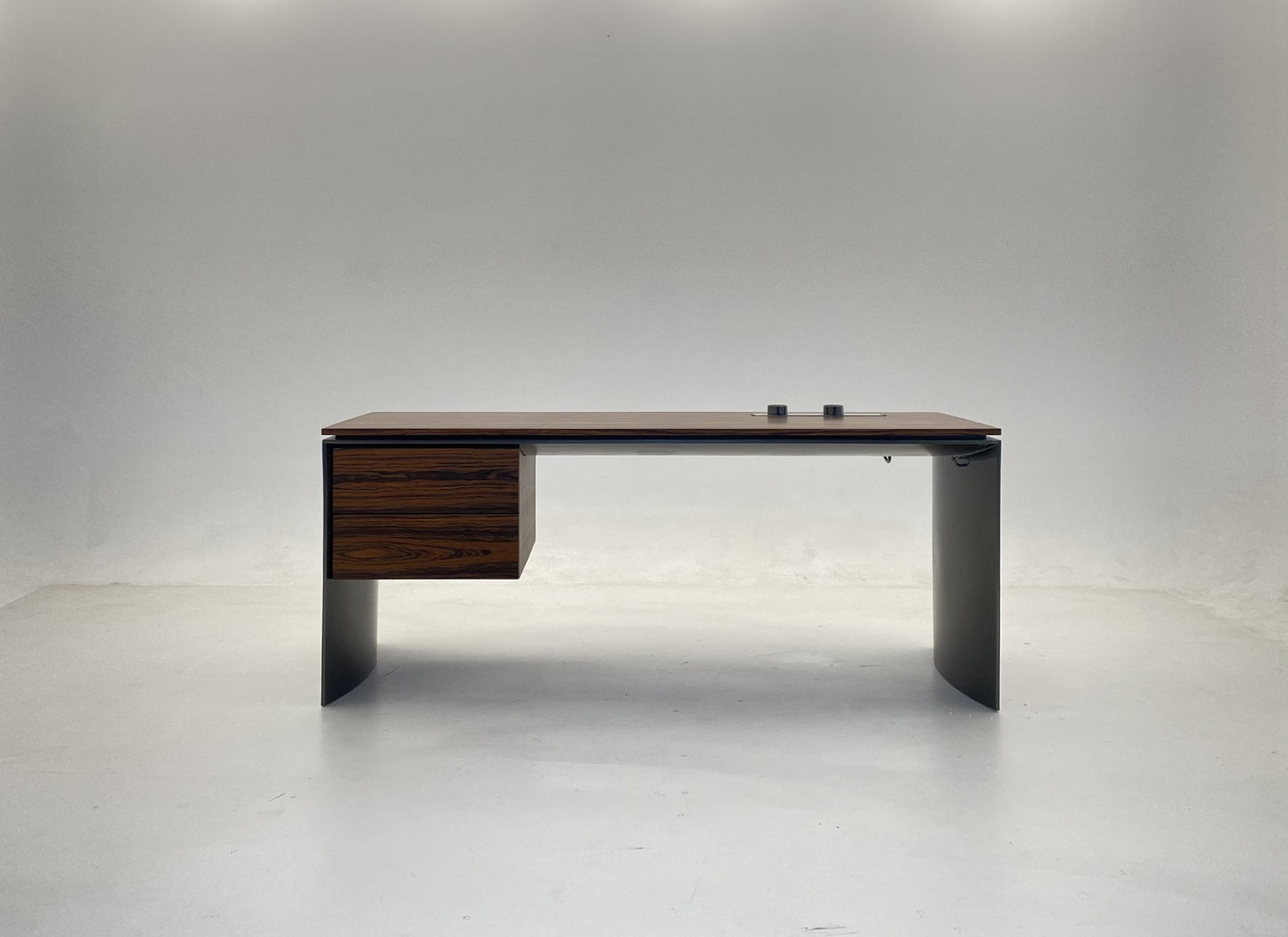 description | The entire frame is characterised by sides with a Golden Brown finish, while the top and front of the drawers are in Dark Brown stained palisander Santos, with a matt polyester lacquered finish, wood with an interesting texture that adds volumes of personality to the design. A cable hole compartment is located on the table top, which can house a storage tray in Golden Brown varnished metal, with internal partitions and a background in Dark Brown saddle-hide positioned near the drawers. |