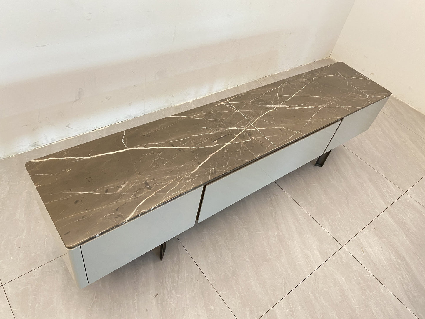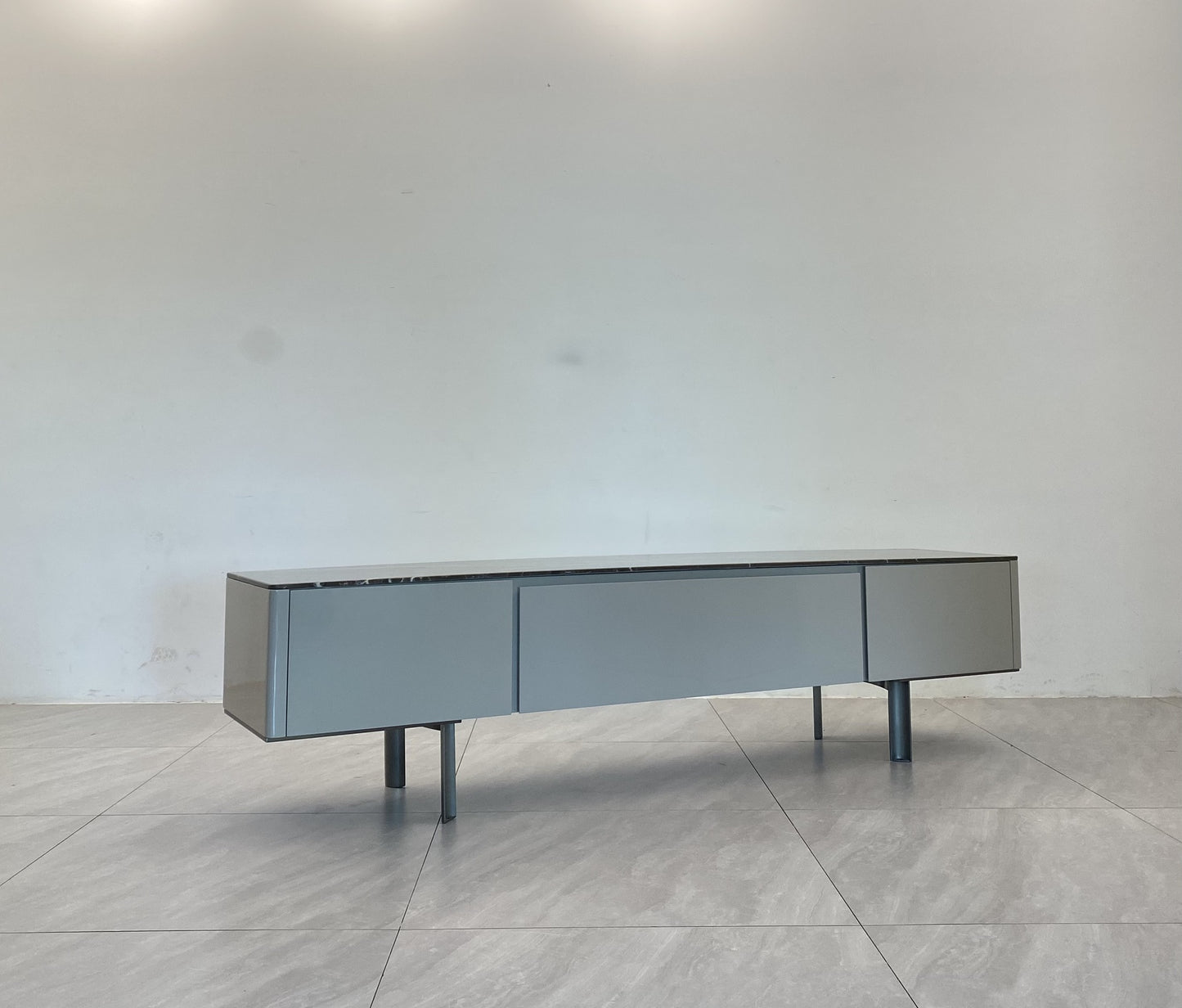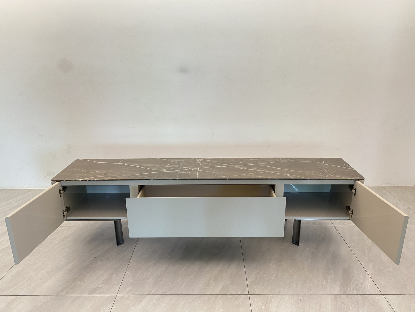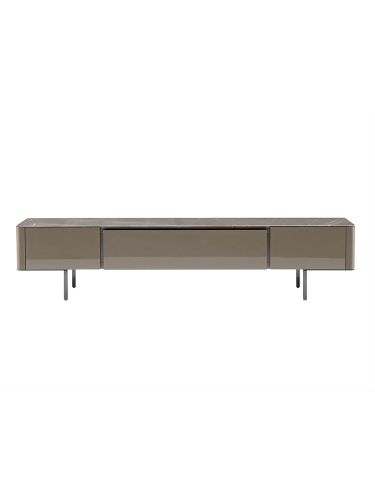 description | A combination of fine cabinet-making and high-end technology, the Lou 2020 sideboards blend exquisite craftsmanship with an updated look, featuring new materials, colours and structural details. The Lou family, designed in 2017 by Christophe Delcourt and now revisited, includes a series of elements for the various areas of the home, such as the living sideboard and its TV console table version, and the dining, bar and night sideboards.A combination of fine cabinet-making and high-end technology, their common denominators are their use of precious materials, such as Stone Grey marble, and the refined workmanship of the glossy Mud colour lacquer finish on the doors and back, and the matt Mud colour finish on the sides, while the base is in Pewter colour metal.While maintaining the same precious, stylish details, they are a lighter version of the original, also in the new design of the legs, with square section. |