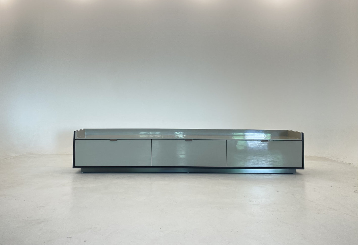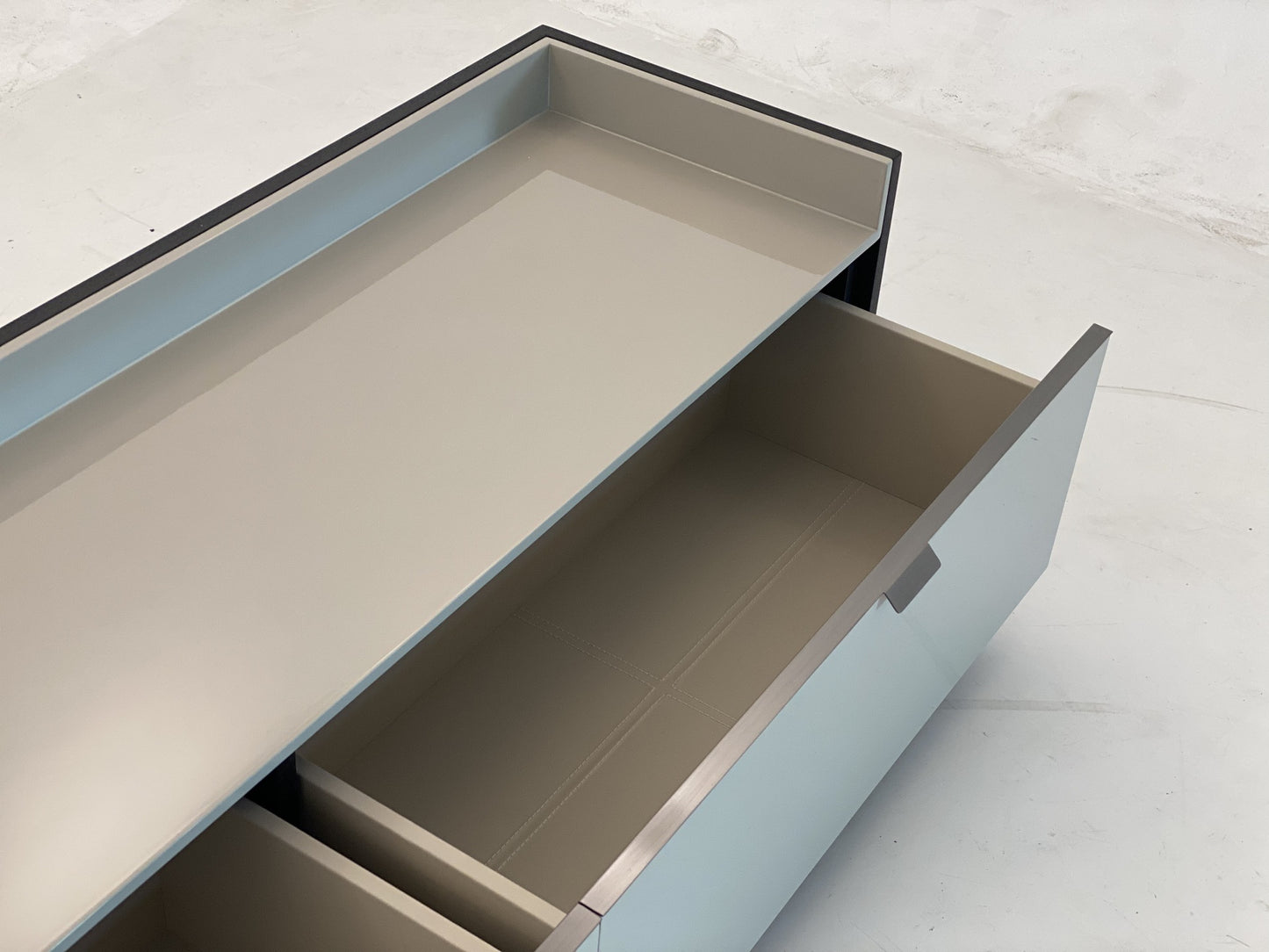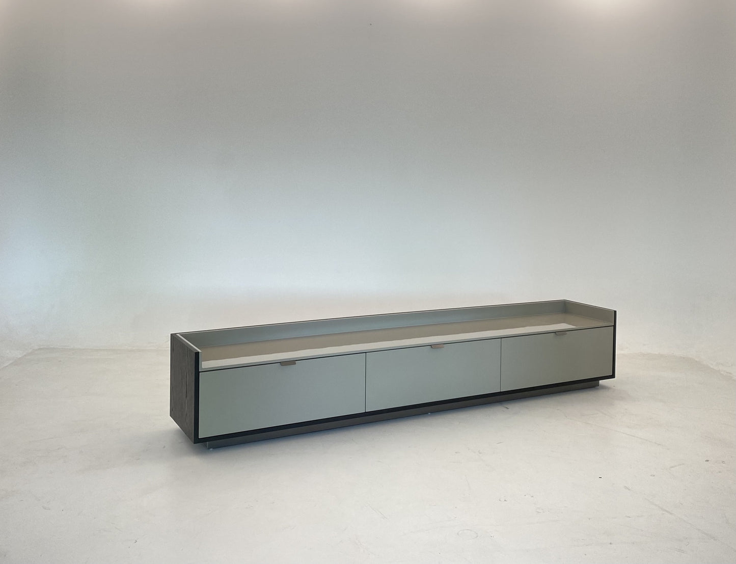 description | The apparent formal simplicity of Darren and its rational, accurate design conceal a piece that is far more complicated and intricately structured than meets the eye. The central element in Moka-coloured ash wood features a shelf closed in on three sides, lined with Malt-coloured satin finish aluminium strips, and stands on a base in the same finish.The glossy Clay-, Sand- and Corten-coloured painted doors are opened with a handle in metal to match the top of the unit, fashioned out of the strip used to finishes their top edge. |