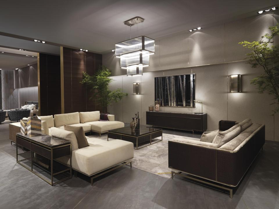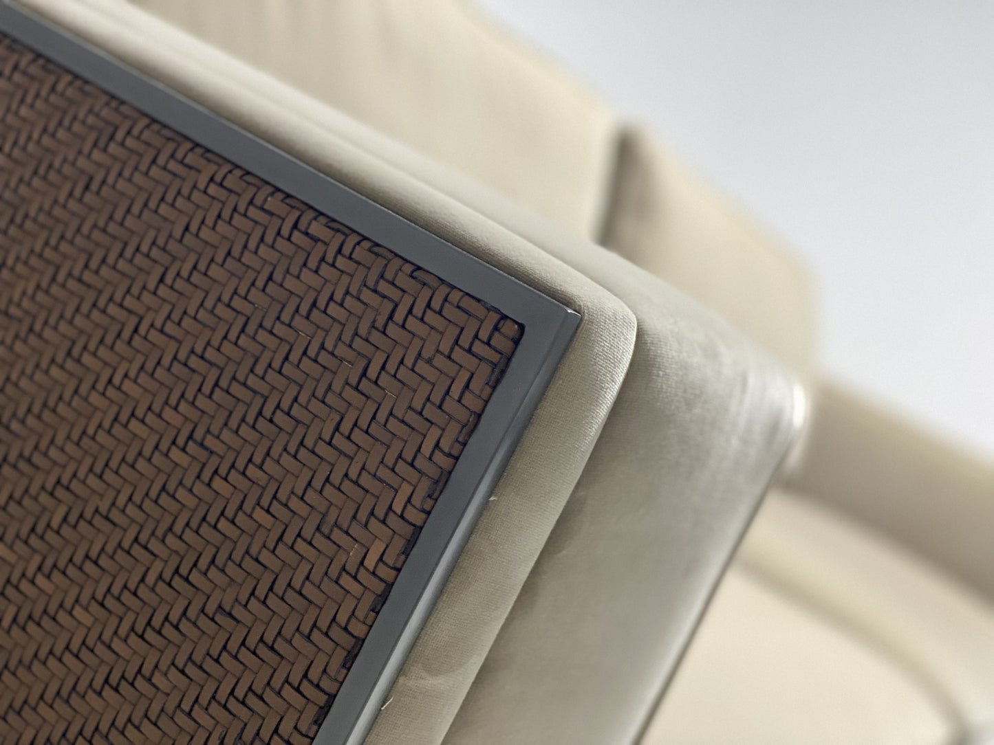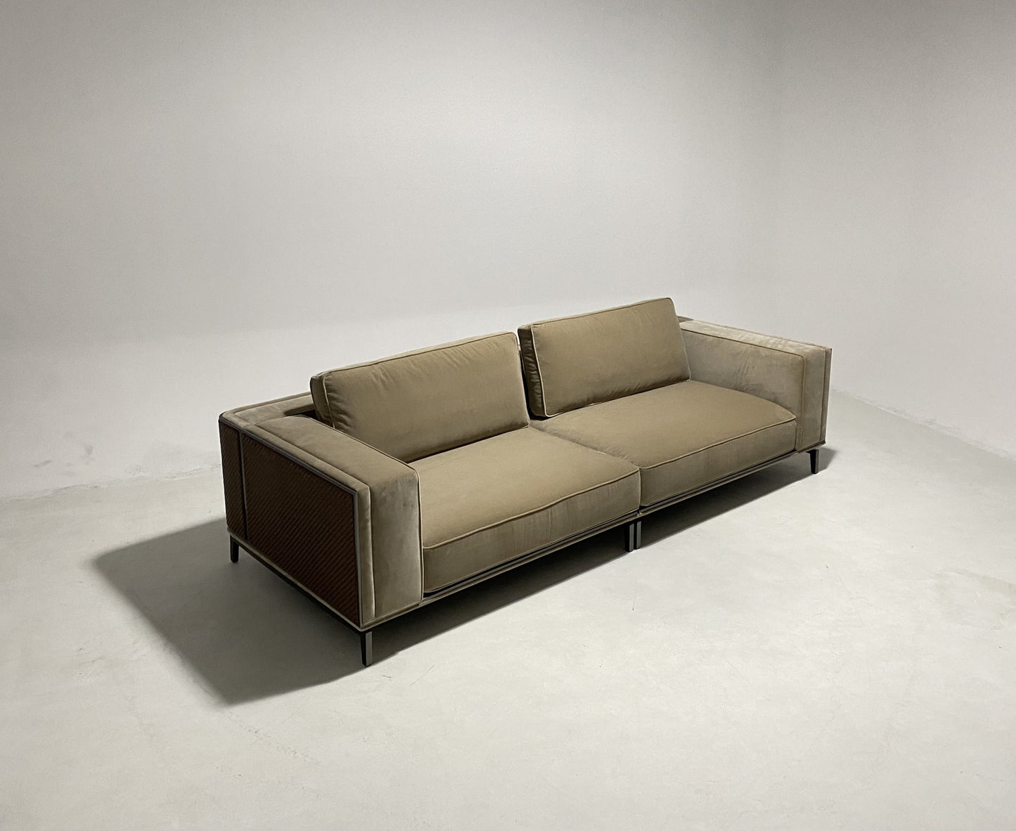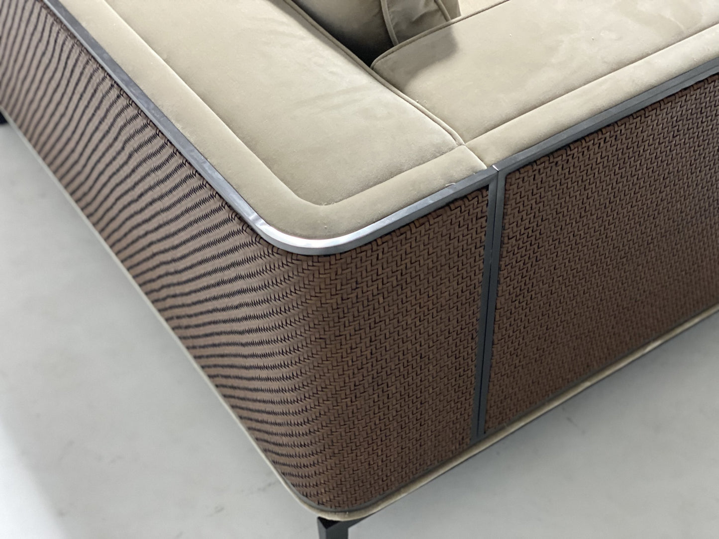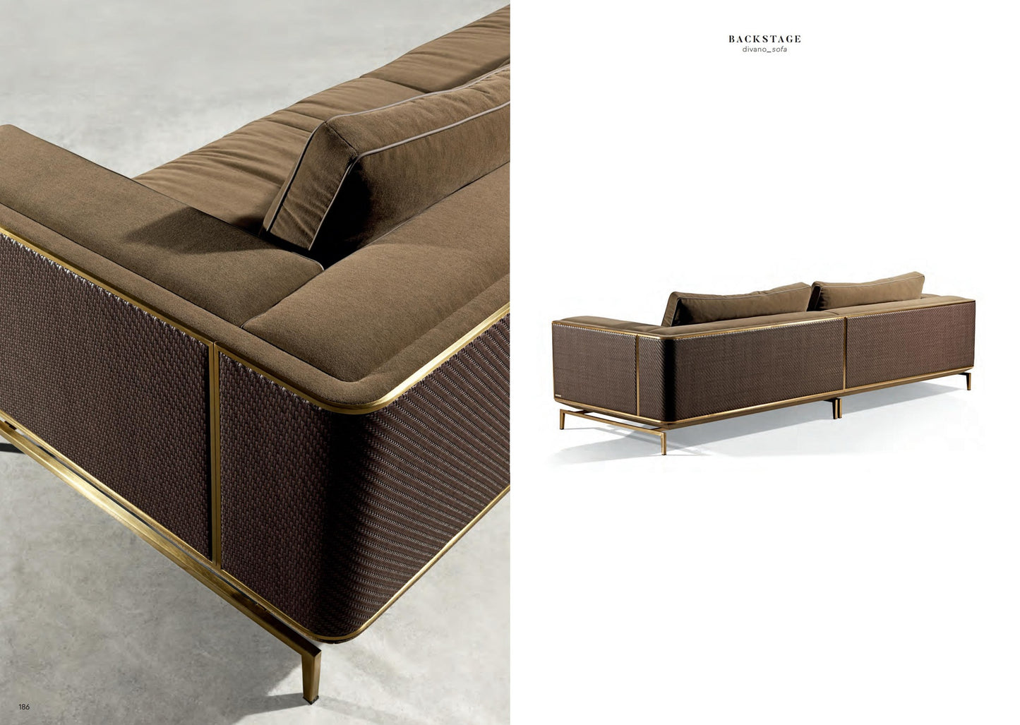 description | Sofa upholstered in leather or fabric, with base composed of a frame in satinized stainless steel and a panel in wood and metal covered in leather or fabric, equipped with elastic belts for the seats suspension. Armrests and backrests made of a wooden panel edged by a steel profile th.10x10 mm, and upholstered with leather, fabric or woven leather padded on the inside. Seat cushions in polyurethane with different densities, memory foam® and feather. Back and armrest cushions in polyurethane and feather, loose cushions in feather. Metal parts available in the satinized metal finishing selection. Modular sofa available with central elements without backrest that can be combined with the Banner console. |