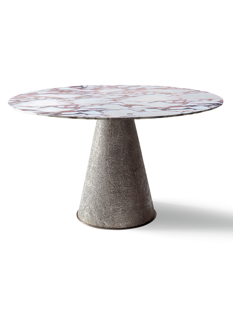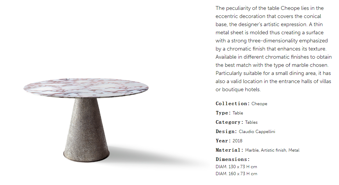 description | The peculiarity of the table Cheope lies in the eccentric decoration that covers the conical base, the designer’s artistic expression. A thin metal sheet is molded thus creating a surface with a strong three-dimensionality emphasized by a chromatic finish that enhances its texture. Available in different chromatic finishes to obtain the best match with the type of marble chosen. Particularly suitable for a small dining area, it has also a valid location in the entrance halls of villas or boutique hotels. |