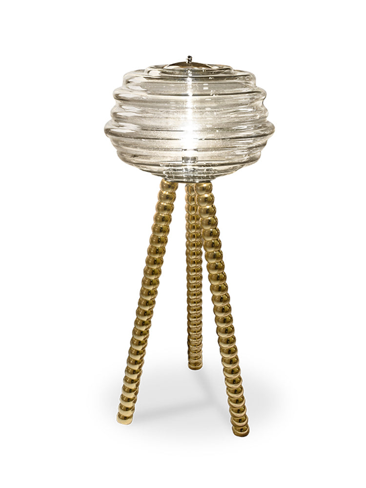 description | Floor lamp Cooper is composed by three metal legs that merge at the base of a glass blown element realized by master glassmakers in Venice area. The light comes out through the glass exalting its preciousness in terms of colour and shape while the metal part is realized as if they were a chain made up of little spheres. |