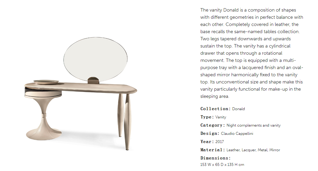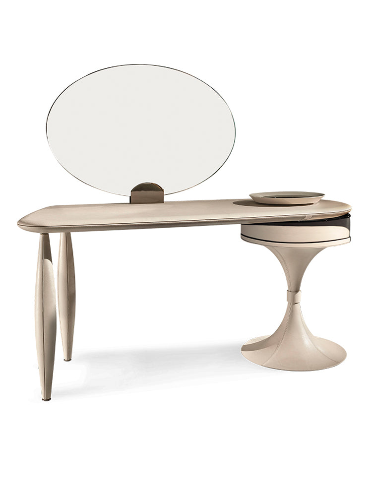 description | The vanity Donald is a composition of shapes with different geometries in perfect balance with each other. Completely covered in leather, the base recalls the same-named tables collection. Two legs tapered downwards and upwards sustain the top. The vanity has a cylindrical drawer that opens through a rotational movement. The top is equipped with a multi-purpose tray with a lacquered finish and an oval-shaped mirror harmonically fixed to the vanity top. Its unconventional size and shape make this vanity particularly functional for make-up in the sleeping area. |