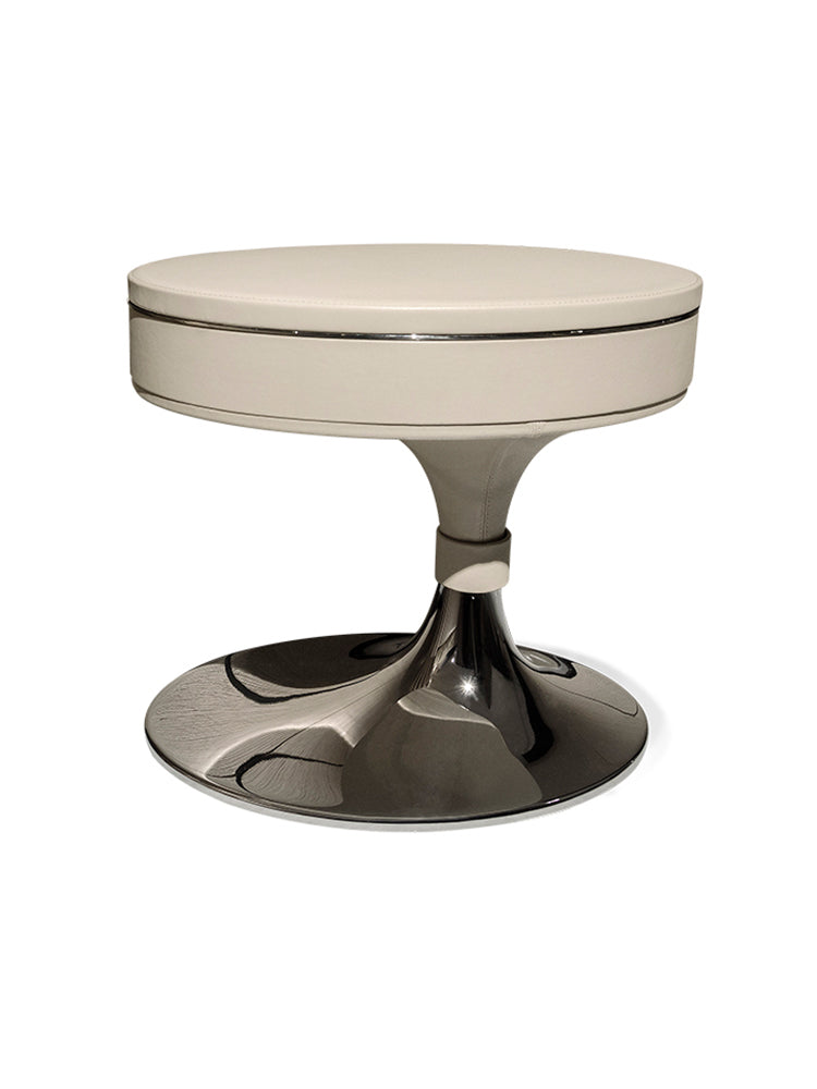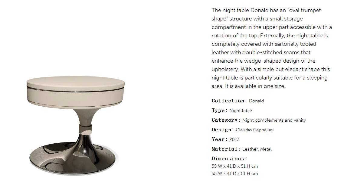 description | The night table Donald has an “oval trumpet shape” structure with a small storage compartment in the upper part accessible with a rotation of the top. Externally, the night table is completely covered with sartorially tooled leather with double-stitched seams that enhance the wedge-shaped design of the upholstery. With a simple but elegant shape this night table is particularly suitable for a sleeping area. It is available in one size. |