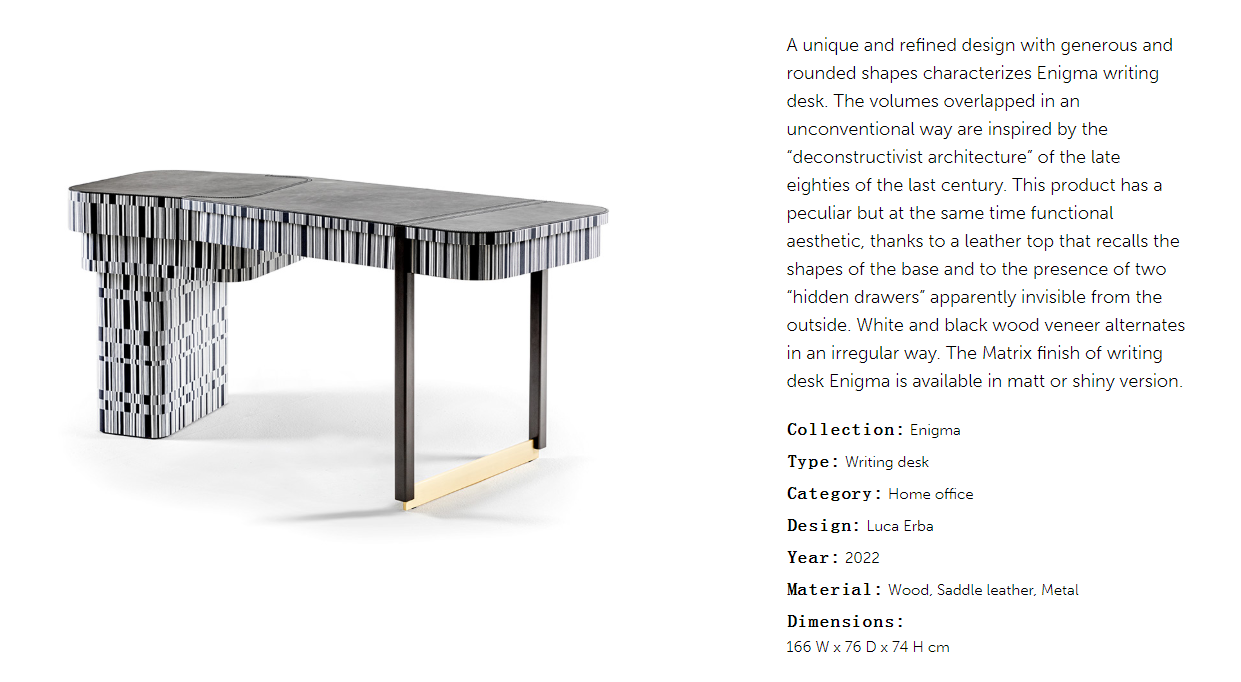 A unique and refined design with generous and rounded shapes characterizes Enigma writing desk. The volumes overlapped in an unconventional way are inspired by the “deconstructivist architecture” of the late eighties of the last century. This product has a peculiar but at the same time functional aesthetic, thanks to a leather top that recalls the shapes of the base and to the presence of two “hidden drawers” apparently invisible from the outside. White and black wood veneer alternates in an irregular way. The Matrix finish of writing desk Enigma is available in matt or shiny version. |