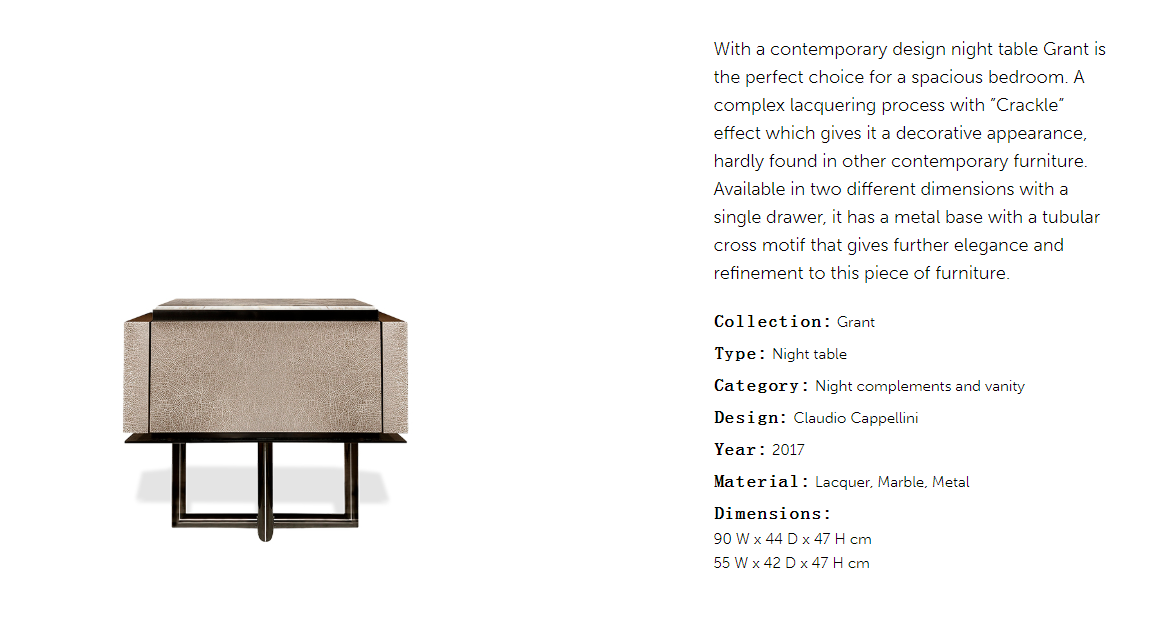 description | With a contemporary design night table Grant is the perfect choice for a spacious bedroom. A complex lacquering process with ”Crackle” effect which gives it a decorative appearance, hardly found in other contemporary furniture. Available in two different dimensions with a single drawer, it has a metal base with a tubular cross motif that gives further elegance and refinement to this piece of furniture. |