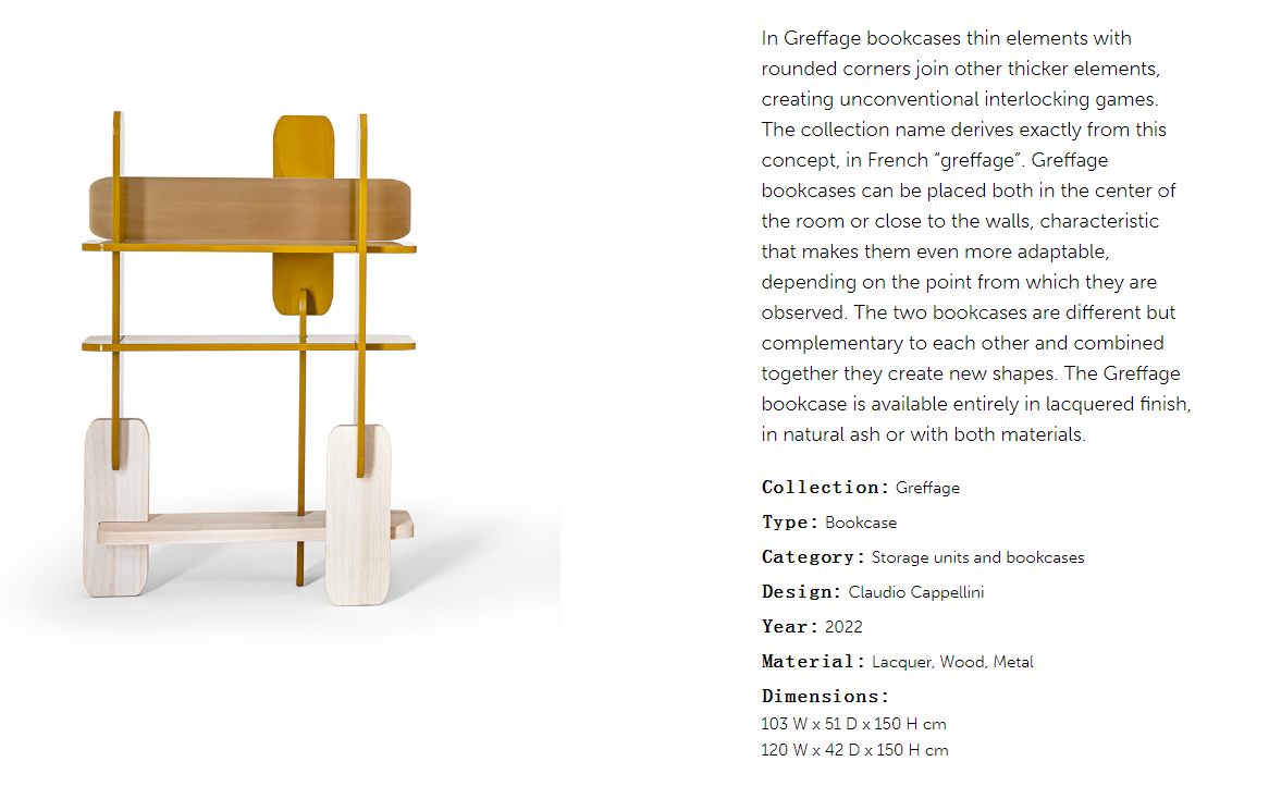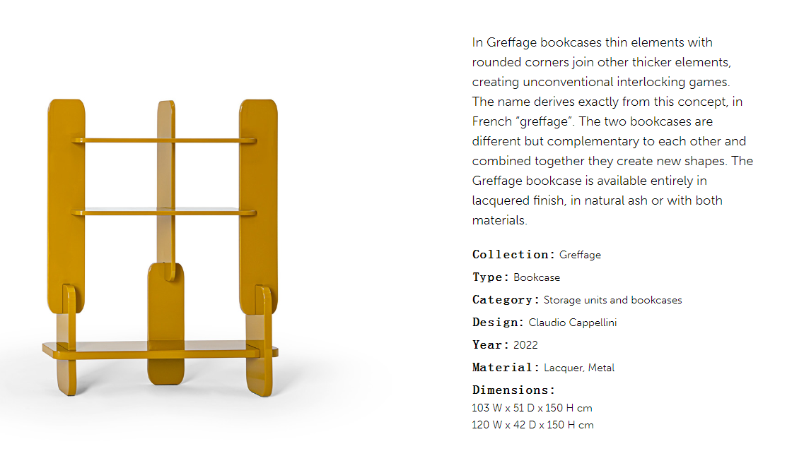 description | In Greffage bookcases thin elements with rounded corners join other thicker elements, creating unconventional interlocking games. The name derives exactly from this concept, in French “greffage”. The two bookcases are different but complementary to each other and combined together they create new shapes. The Greffage bookcase is available entirely in lacquered finish, in natural ash or with both materials. |